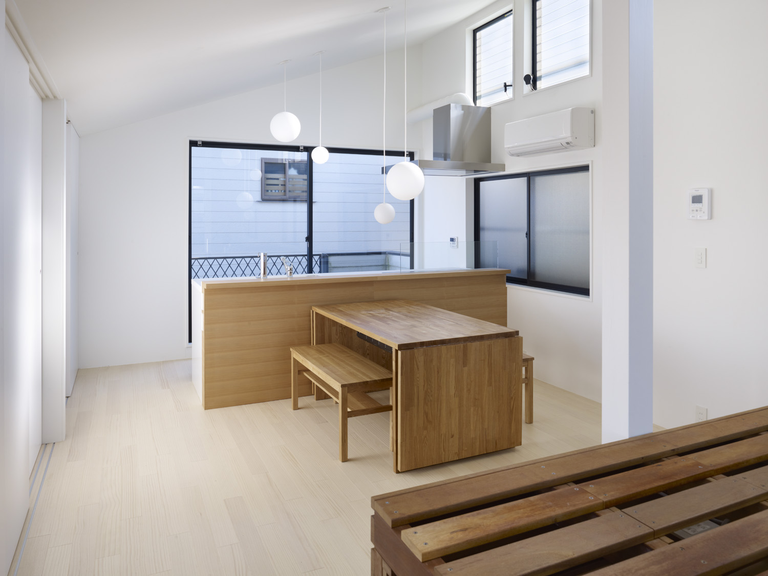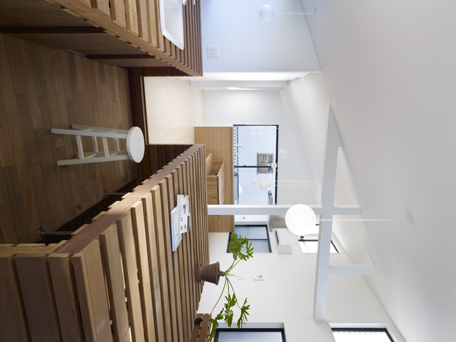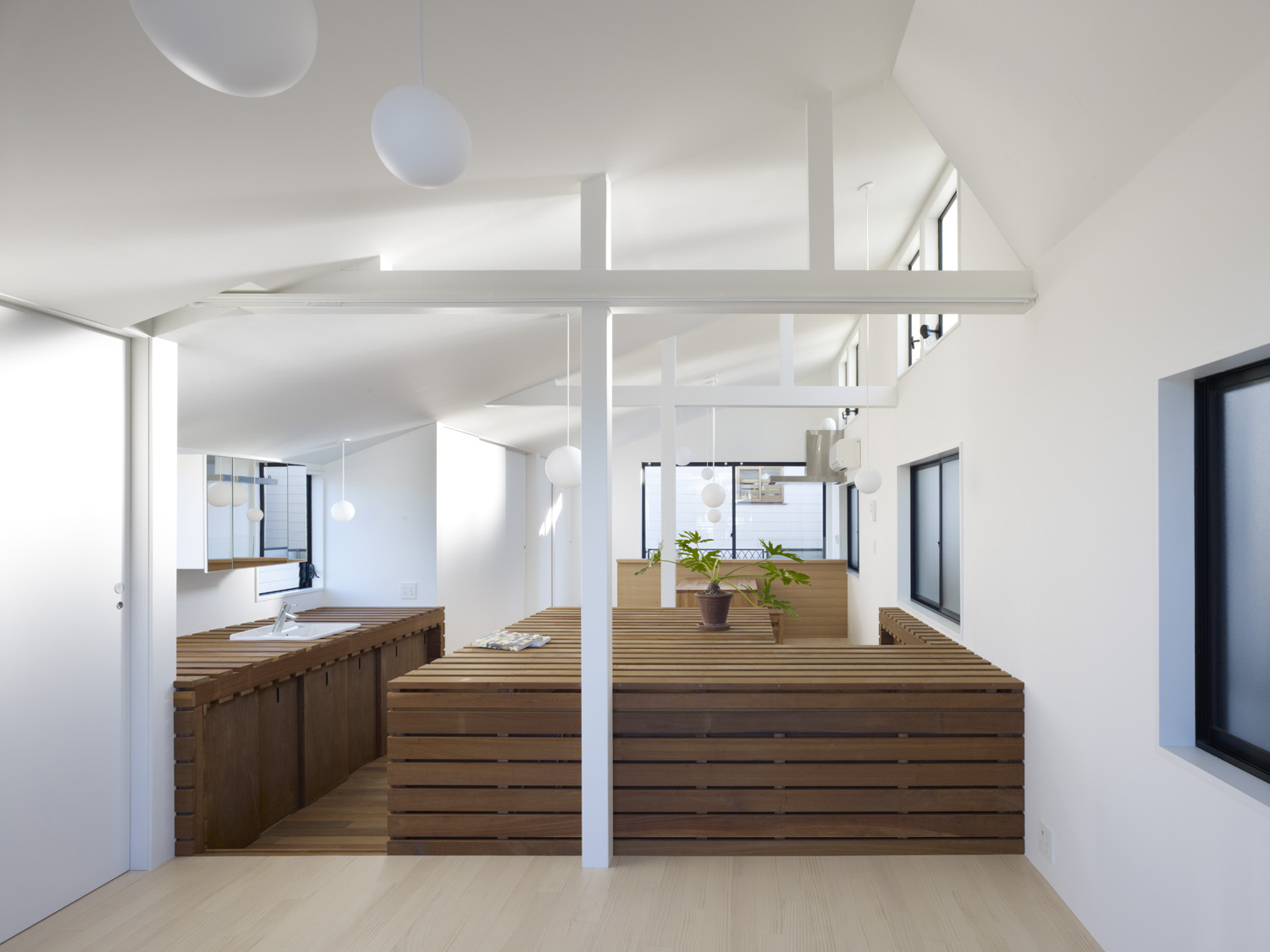 既存建物は築17年の一戸建て、ガレージ付き半地下コンクリートの上に木造2階の4LDK、さしあたり住むことはできるが、どういう経緯でその間取りになったのか分からない状態だった。 新しいオーナーは夫婦+子供の3人家族。建物中央にホールのような箱状の空間をつくり、そこから夫人が開設する治療院、夫婦の寝室、玄関ポーチ、上階のリビングダイニング、下階のカラオケ室、それぞれへの出入口を設けた。様々な用途の部屋を既存建物内に再配置して、住宅というより複合施設のような構成になった。各部屋間の動線をまとめて関係づける箱状の空間は、いわば間取りのスイッチボックスだ。 箱はデッキ材を使って目透かし張りで仕上げている。その天面には下階へ光が落ちるように大きめの隙間を開け、側面には視線を通さず声が聞こえる程度に小さめの隙間を開けた。2階から地下まで空間の緩やかな連続性をつくると同時に、来客時にはプライバシーが守られるように隙間を調整している。 2階のリビングダイニングでは、箱の天面を家事に適したカウンターの高さとしてあるが、頭上の勾配天井に沿ってハイサイド窓から陽が入るため、天面に上がればサンルームのようにも使える。デッキ材の隙間にフックを取り付けて、絵やハンガー、観葉植物を好きな所に掛けることもできる。屋外に庭がほとんどないので、箱を用いて室内でどれだけ多様な生活風景を展開できるか考えた。 改装前の中古住宅は、不動産市場に多く流通している典型的なものだった。今回は半地下コンクリートの防音性に着目してカラオケ室をつくったが、そういった特性を利用して新たな住環境を整える方法が他にも色々あるのではないかと、可能性を感じている。 -中佐昭夫- Name of the Project : Switch Box in House Switch Box in House This is a total interior renovation project of an existing house, installing a box made of deck lumber in the middle of the house. The existing house is 17 year-old, two-story, 4-bedroom wooden structure on top of semi-underground garage. It could serve as home, but we could not see how and for whom the room layout was made. New owner of the house is a family of three; a couple with a child. Installed in the center of the house is a hall-like space made by a large box which gives a doorway to chiropractic clinic run by the wife, to the bedroom of the couple, to the entrance of the house, to living and dining room upstairs, and to karaoke room in basement. As rooms of various purposes were relocated in the existing house, the composition of the house became more like that of a complex facility. The box-like space which brings together traffic lines and connects each room is, in a sense, switch box of traffic lines. The box is made of deck lumber, whose top side has large interspace between lumber and let sunlight pour downstairs. On the sides of the box are smaller interspaces to avoid the gaze but large enough to let through the voices. It allows loose spatial continuity from the second floor to the basement and at the same time, interspaces are adjusted to keep privacy when there are guests. In the living-dining room on the second floor, the top of the box comes up to the height of a counter suitable for housework. High side windows on the sloped ceiling take in ample sunshine and the top of the box can be used as sunroom. Hooks can be placed between the deck lumber to hang pictures, hangers or foliage plants anywhere we like. There is almost no exterior space for garden within the premises, and it was our challenge to introduce various living scenes indoors by using the box. The existing house before the renovation was one of many typical houses in the real estate market. In this renovation, we made Karaoke room in the basement, taking advantage of the sound insulation properties of concrete foundation. We see possibilities in creating new living environment by taking advantage of such properties. – Akio Nakasa – |