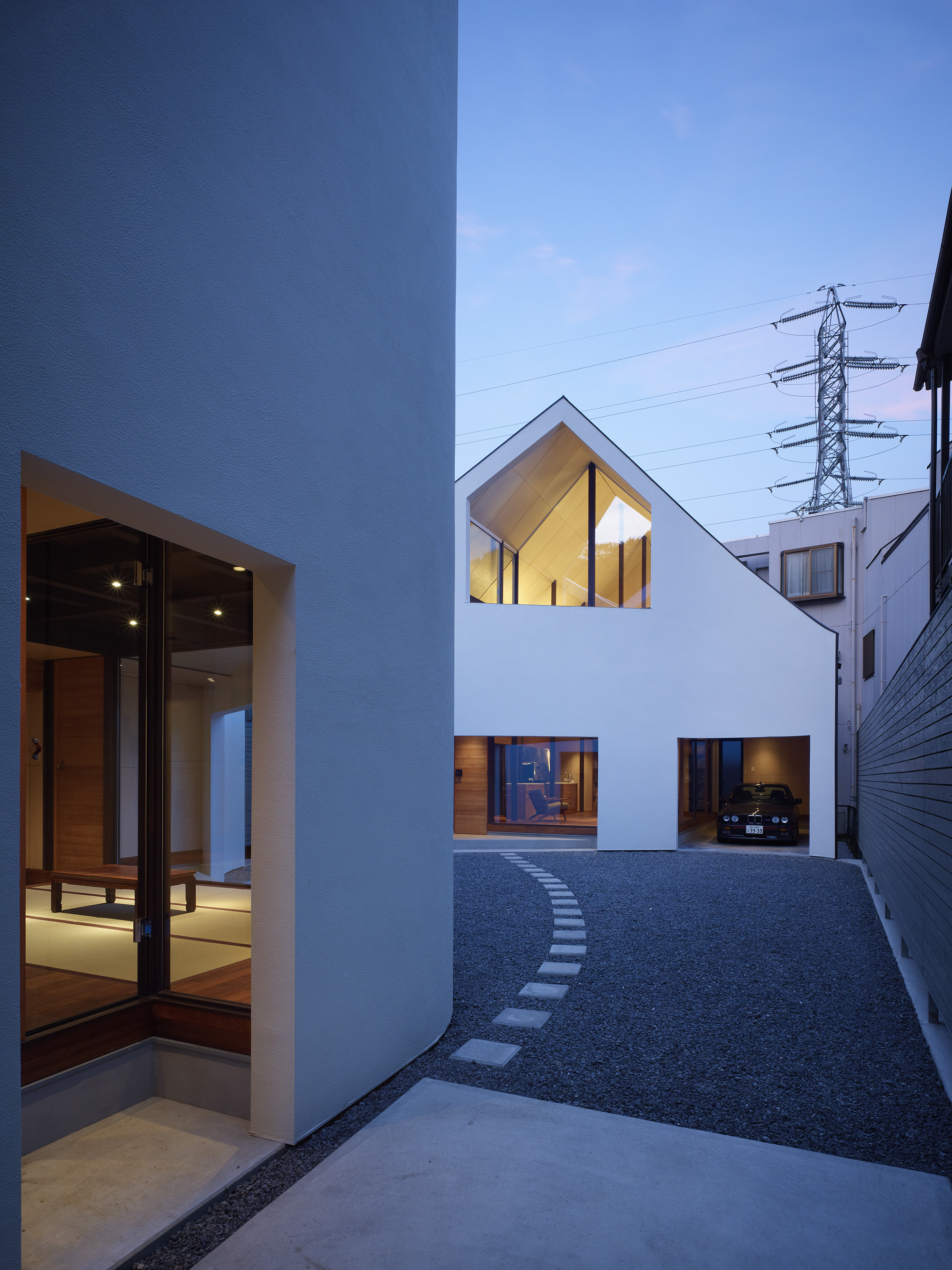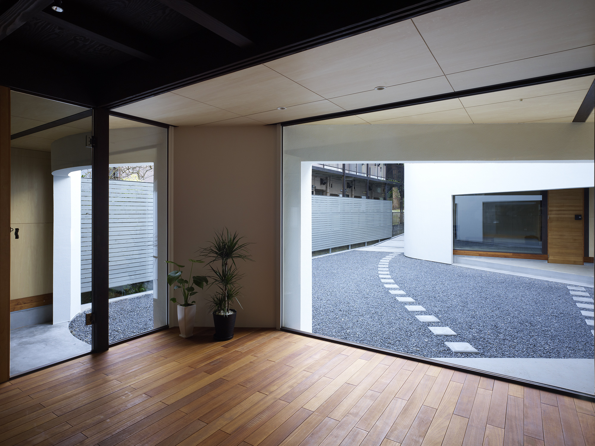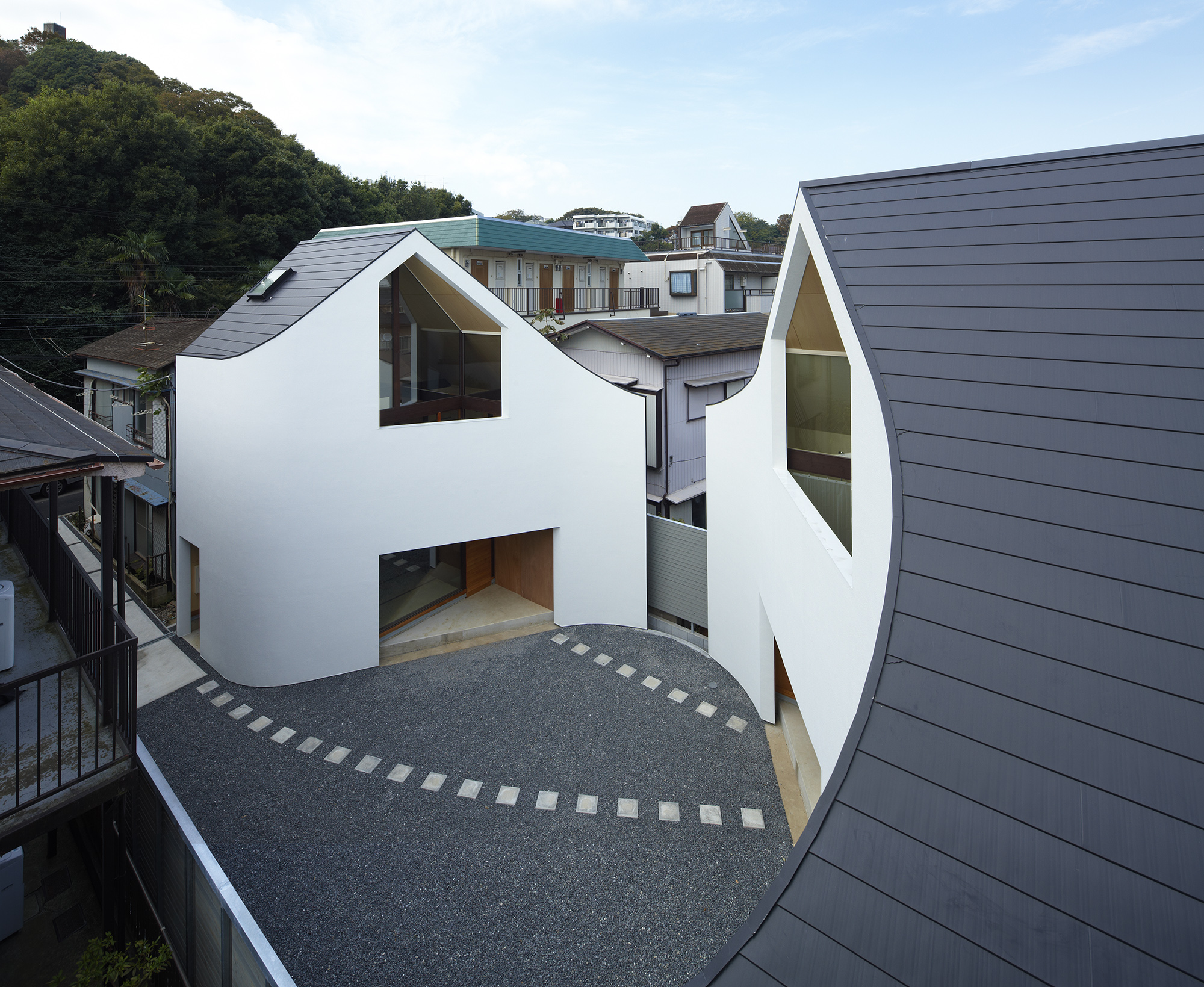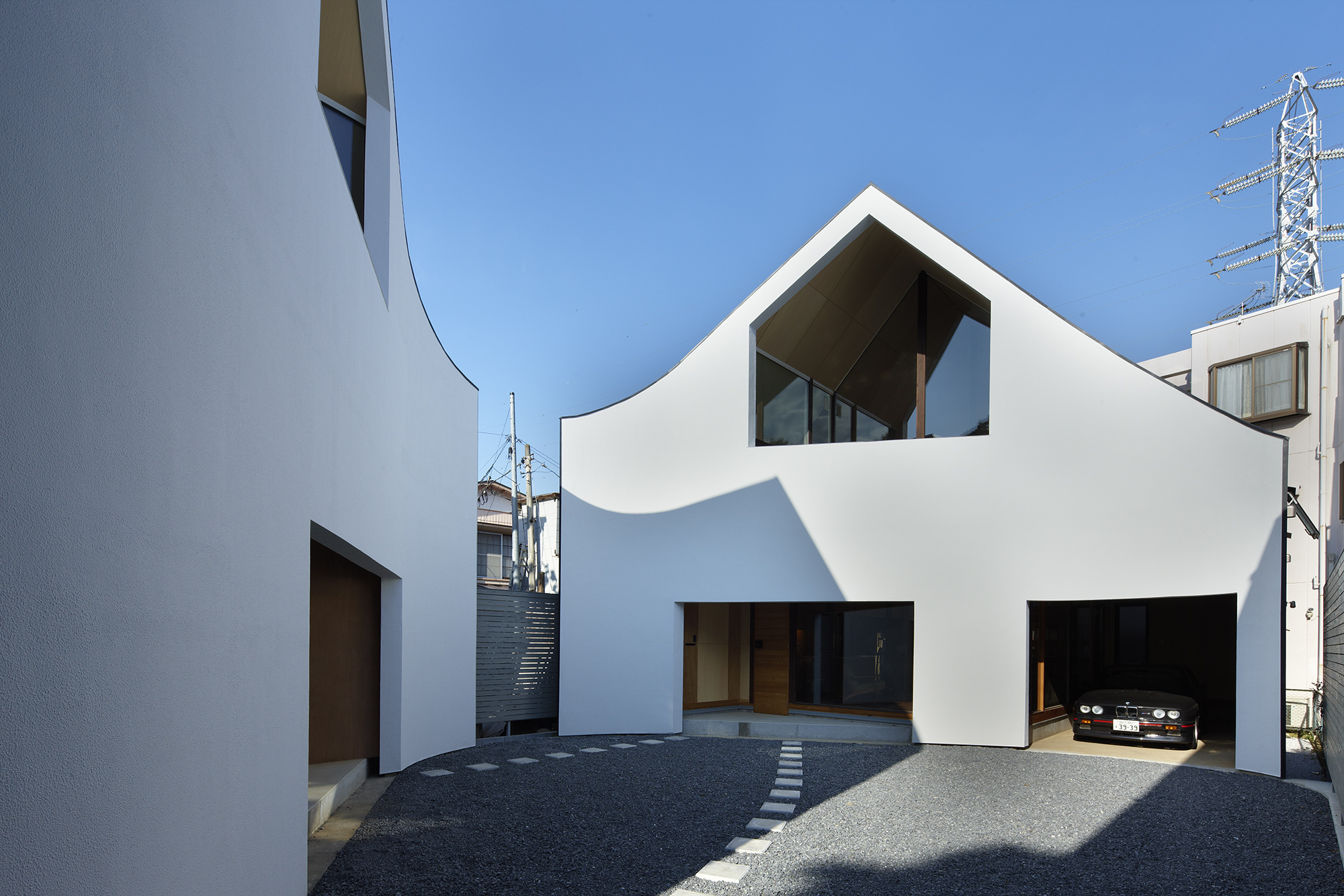 少しだけ離れて建つ2つの家に、1つの家族が住む計画。敷地いっぱいに大きな1つの家のボリュームを仮定して、それを曲線でくりぬき、残った2つのボリュームを実際の家として建てた。残った2つの家が「元々1つのボリューム」という仮定に従って、図面上の通り芯や木軸の構造形式、仕上げ材料を共通させ、離れているけれども繋がっているような関係を持たせた。くりぬいた部分は2つの家へのアプローチを兼ねた中庭になっている。