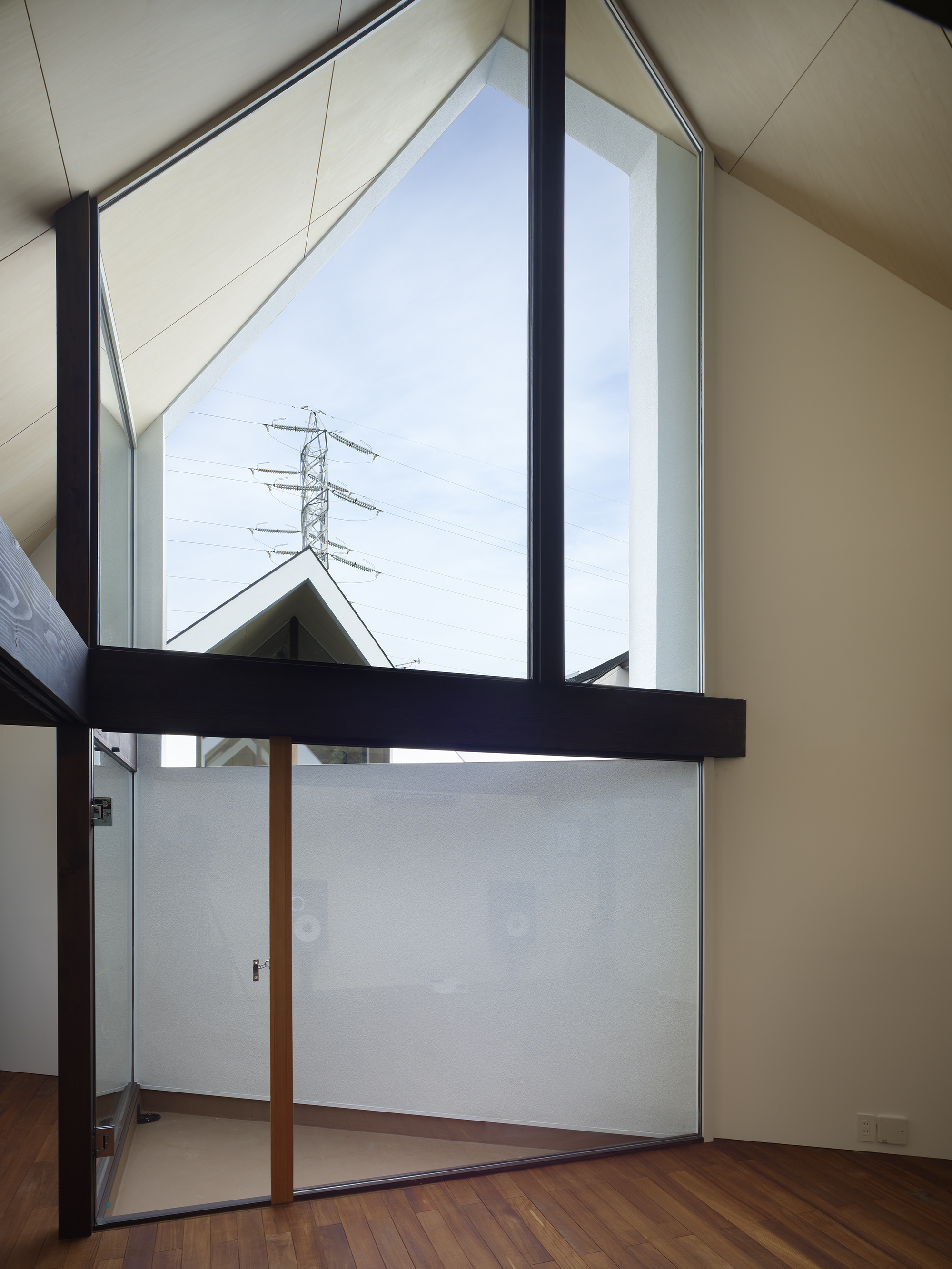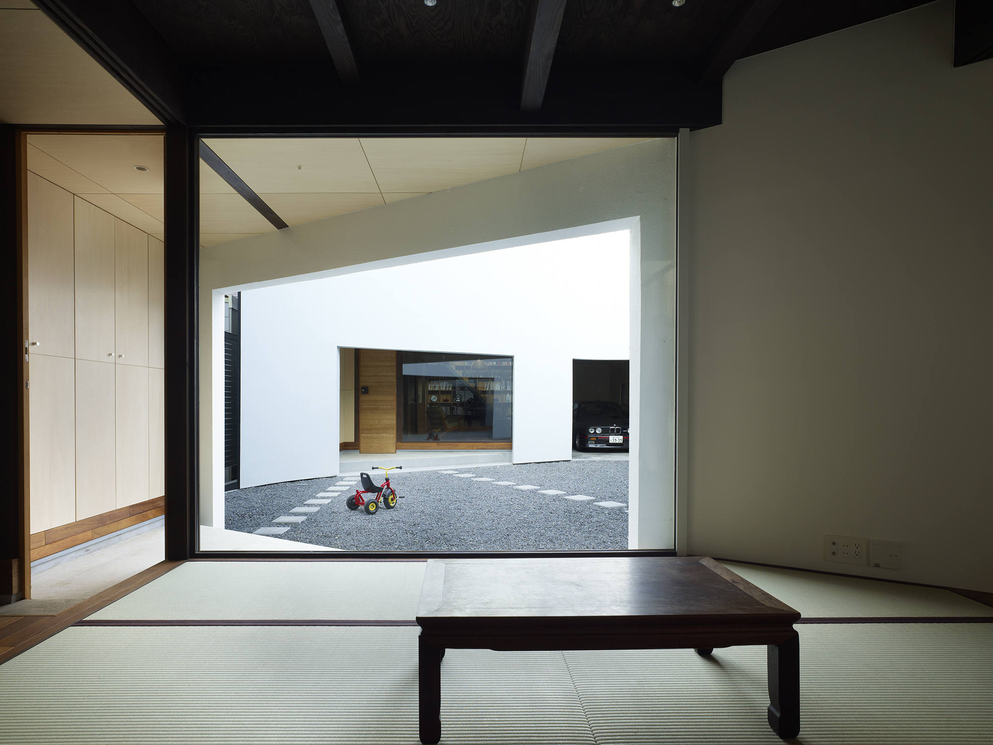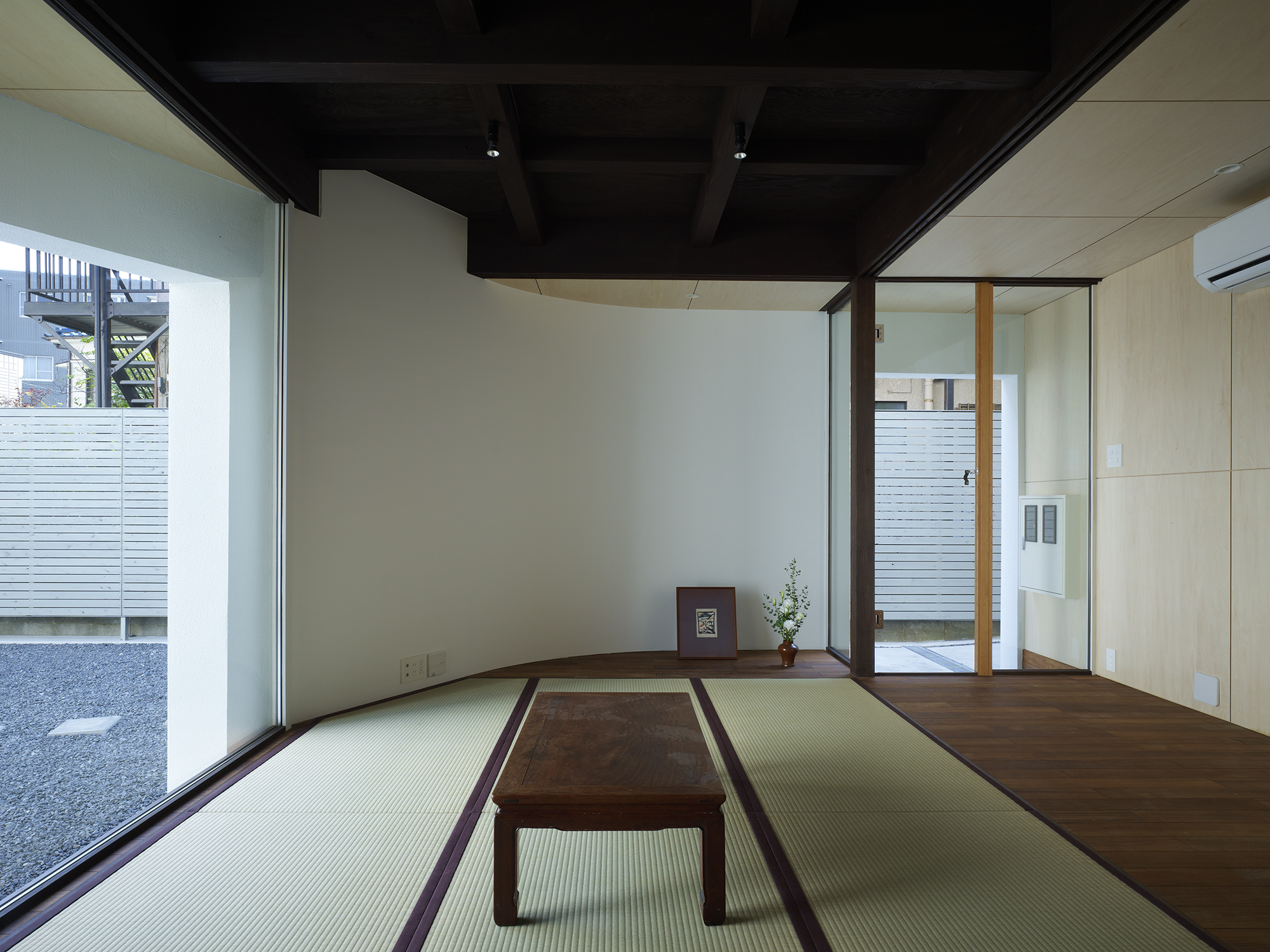 少しだけ離れて建つ2つの家に、1つの家族が住む計画。敷地いっぱいに大きな1つの家のボリュームを仮定して、それを曲線でくりぬき、残った2つのボリュームを実際の家として建てた。残った2つの家が「元々1つのボリューム」という仮定に従って、図面上の通り芯や木軸の構造形式、仕上げ材料を共通させ、離れているけれども繋がっているような関係を持たせた。くりぬいた部分は2つの家へのアプローチを兼ねた中庭になっている。