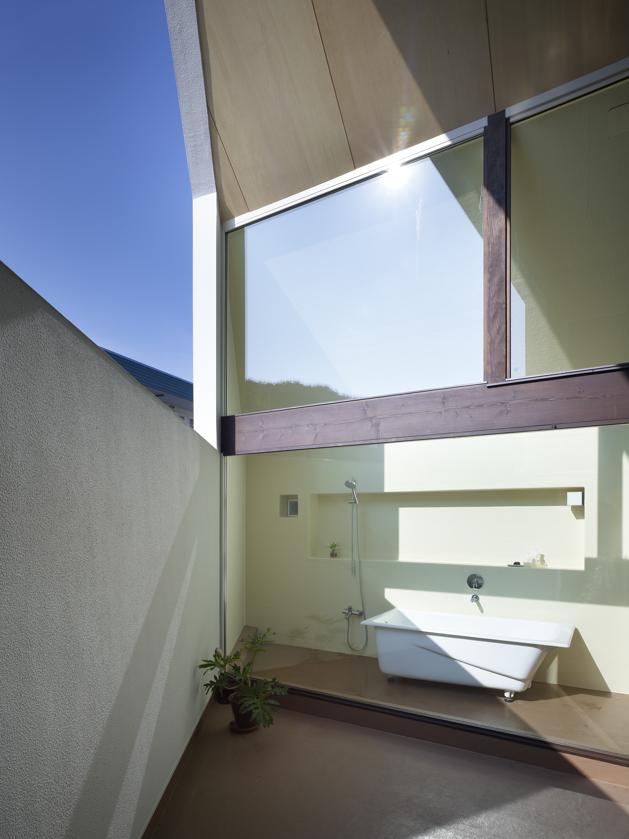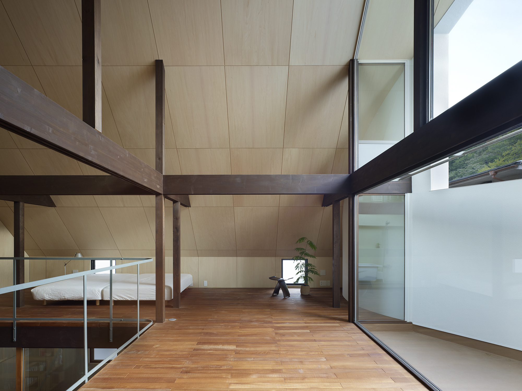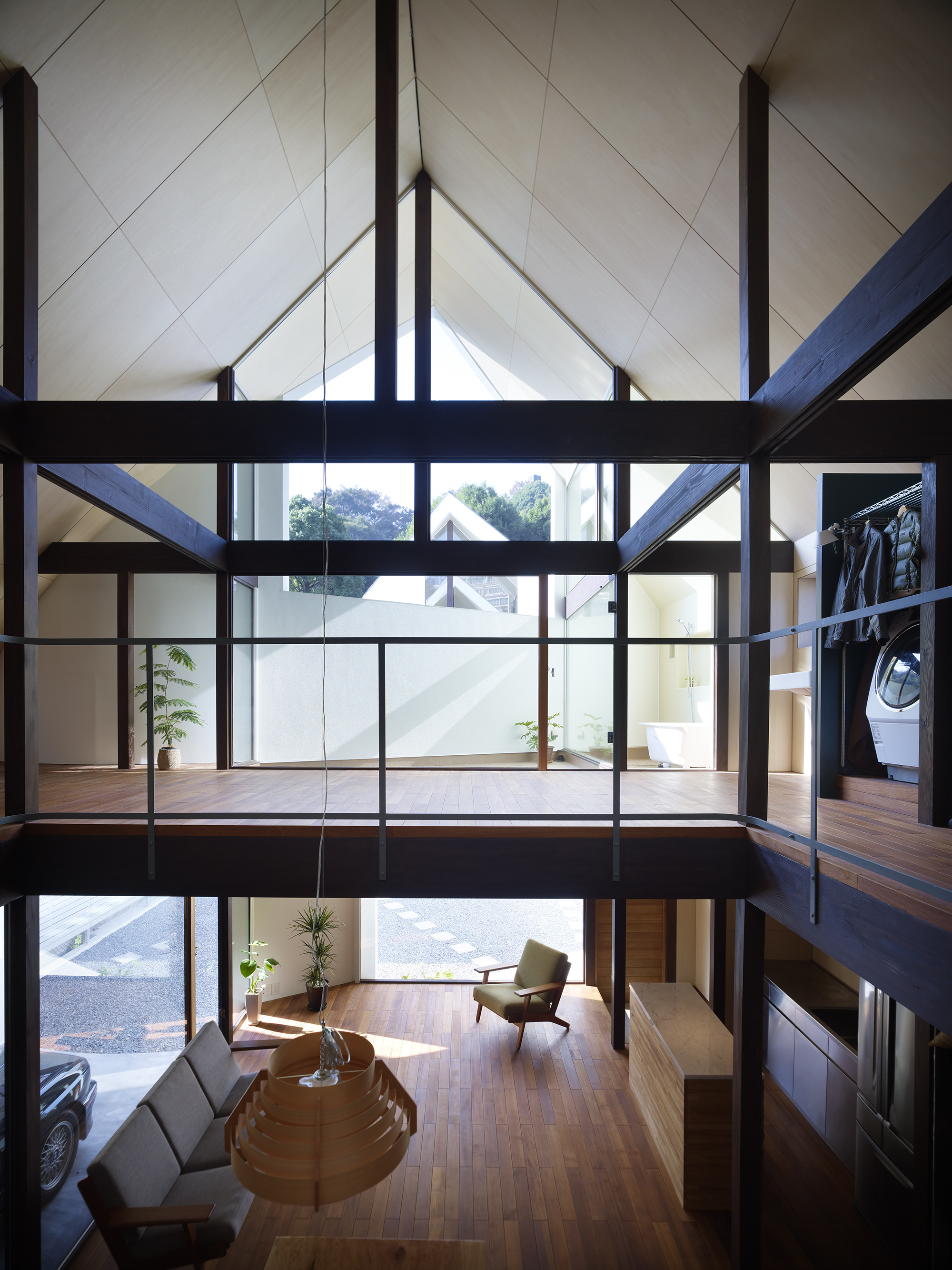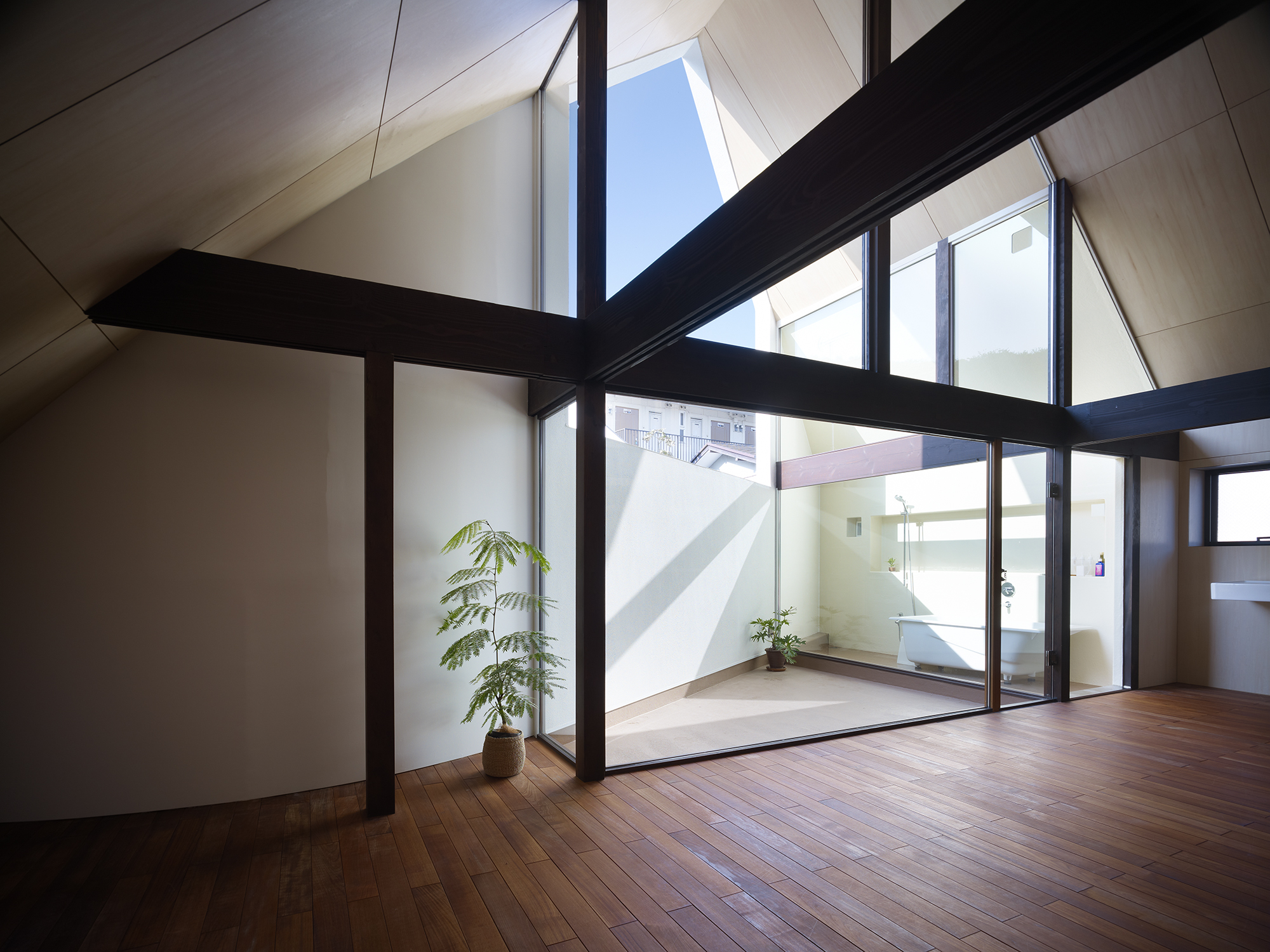 少しだけ離れて建つ2つの家に、1つの家族が住む計画。敷地いっぱいに大きな1つの家のボリュームを仮定して、それを曲線でくりぬき、残った2つのボリュームを実際の家として建てた。残った2つの家が「元々1つのボリューム」という仮定に従って、図面上の通り芯や木軸の構造形式、仕上げ材料を共通させ、離れているけれども繋がっているような関係を持たせた。くりぬいた部分は2つの家へのアプローチを兼ねた中庭になっている。