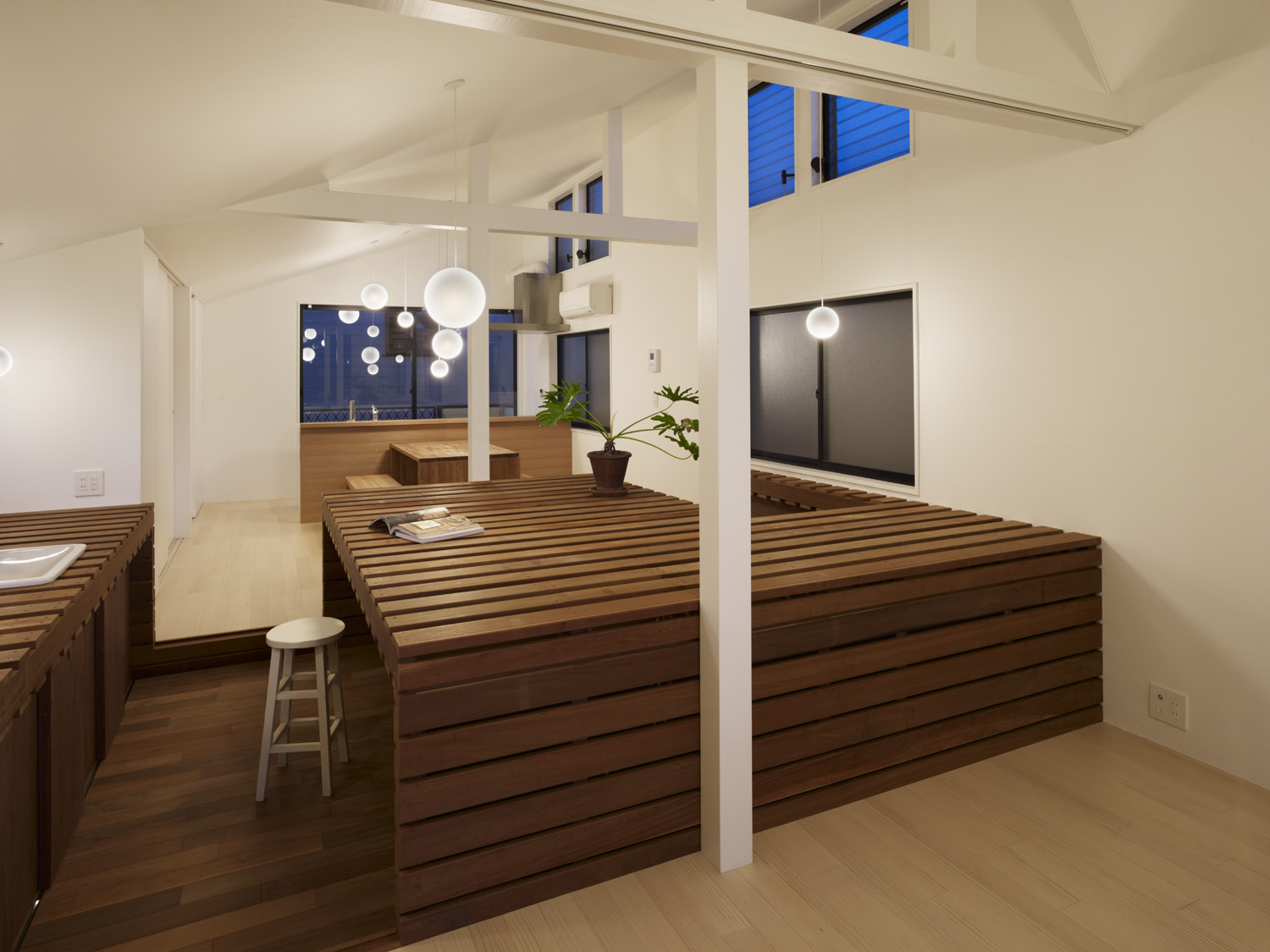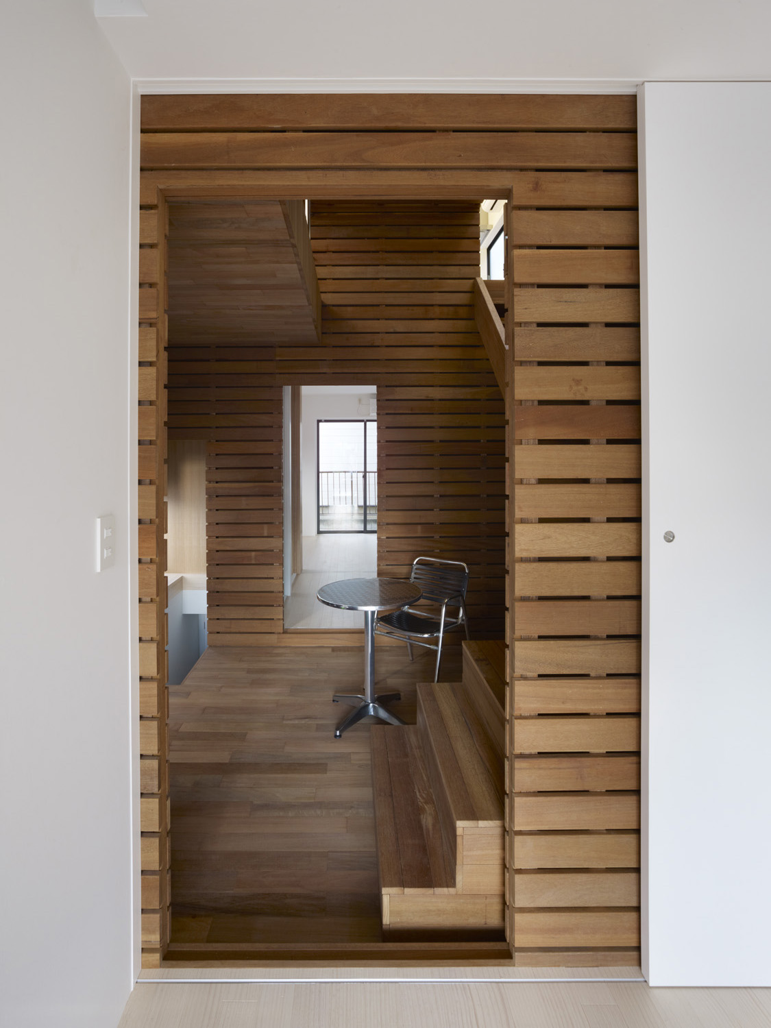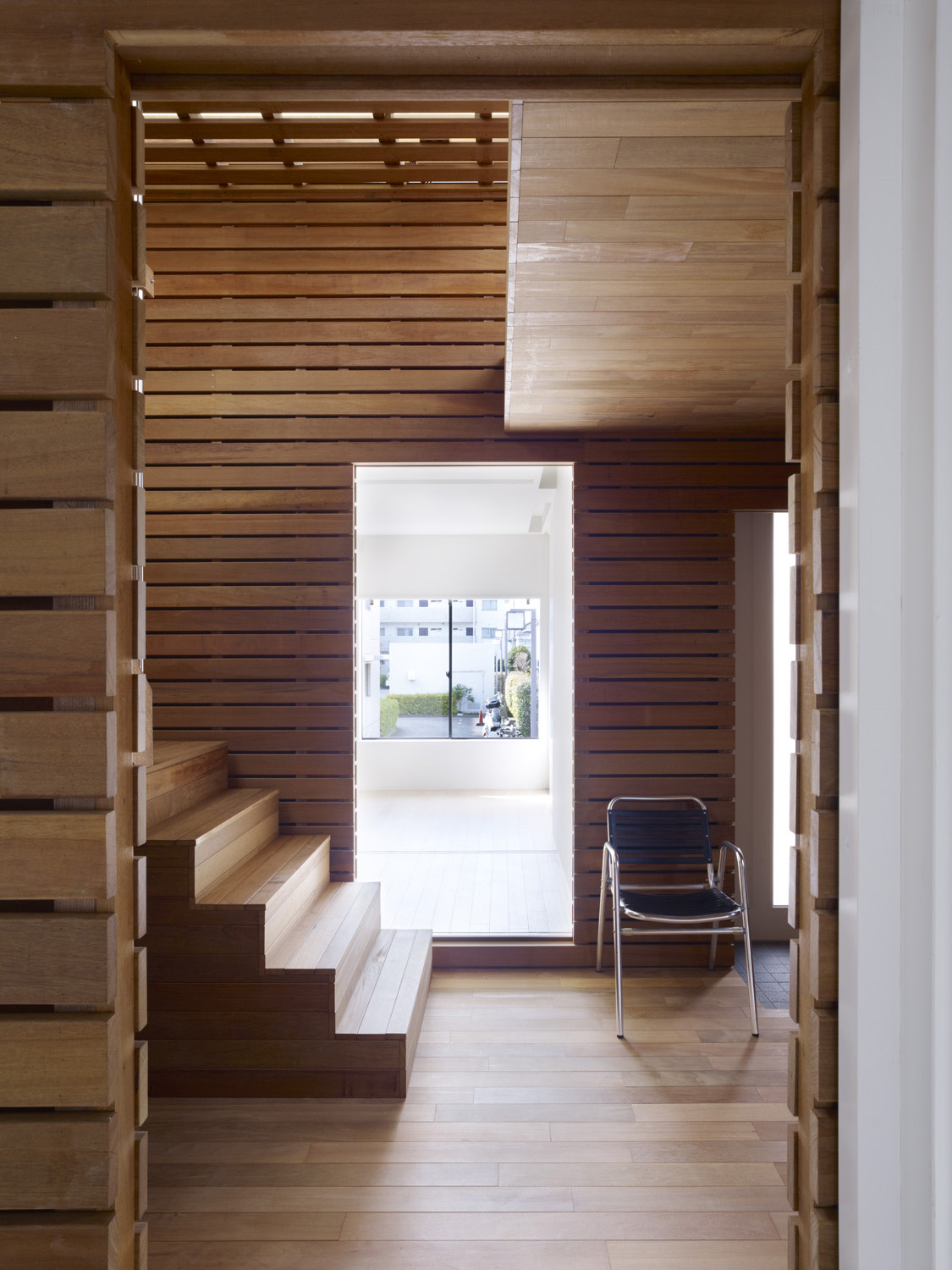 既存建物は築17年の一戸建て、ガレージ付き半地下コンクリートの上に木造2階の4LDK、さしあたり住むことはできるが、どういう経緯でその間取りになったのか分からない状態だった。 新しいオーナーは夫婦+子供の3人家族。建物中央にホールのような箱状の空間をつくり、そこから夫人が開設する治療院、夫婦の寝室、玄関ポーチ、上階のリビングダイニング、下階のカラオケ室、それぞれへの出入口を設けた。様々な用途の部屋を既存建物内に再配置して、住宅というより複合施設のような構成になった。各部屋間の動線をまとめて関係づける箱状の空間は、いわば間取りのスイッチボックスだ。 箱はデッキ材を使って目透かし張りで仕上げている。その天面には下階へ光が落ちるように大きめの隙間を開け、側面には視線を通さず声が聞こえる程度に小さめの隙間を開けた。2階から地下まで空間の緩やかな連続性をつくると同時に、来客時にはプライバシーが守られるように隙間を調整している。 2階のリビングダイニングでは、箱の天面を家事に適したカウンターの高さとしてあるが、頭上の勾配天井に沿ってハイサイド窓から陽が入るため、天面に上がればサンルームのようにも使える。デッキ材の隙間にフックを取り付けて、絵やハンガー、観葉植物を好きな所に掛けることもできる。屋外に庭がほとんどないので、箱を用いて室内でどれだけ多様な生活風景を展開できるか考えた。 改装前の中古住宅は、不動産市場に多く流通している典型的なものだった。今回は半地下コンクリートの防音性に着目してカラオケ室をつくったが、そういった特性を利用して新たな住環境を整える方法が他にも色々あるのではないかと、可能性を感じている。 -中佐昭夫- Name of the Project : Switch Box in House Switch Box in House This is a total interior renovation project of an existing house, installing a box made of deck lumber in the middle of the house. The existing house is 17 year-old, two-story, 4-bedroom wooden structure on top of semi-underground garage. It could serve as home, but we could not see how and for whom the room layout was made. New owner of the house is a family of three; a couple with a child. Installed in the center of the house is a hall-like space made by a large box which gives a doorway to chiropractic clinic run by the wife, to the bedroom of the couple, to the entrance of the house, to living and dining room upstairs, and to karaoke room in basement. As rooms of various purposes were relocated in the existing house, the composition of the house became more like that of a complex facility. The box-like space which brings together traffic lines and connects each room is, in a sense, switch box of traffic lines. The box is made of deck lumber, whose top side has large interspace between lumber and let sunlight pour downstairs. On the sides of the box are smaller interspaces to avoid the gaze but large enough to let through the voices. It allows loose spatial continuity from the second floor to the basement and at the same time, interspaces are adjusted to keep privacy when there are guests. In the living-dining room on the second floor, the top of the box comes up to the height of a counter suitable for housework. High side windows on the sloped ceiling take in ample sunshine and the top of the box can be used as sunroom. Hooks can be placed between the deck lumber to hang pictures, hangers or foliage plants anywhere we like. There is almost no exterior space for garden within the premises, and it was our challenge to introduce various living scenes indoors by using the box. The existing house before the renovation was one of many typical houses in the real estate market. In this renovation, we made Karaoke room in the basement, taking advantage of the sound insulation properties of concrete foundation. We see possibilities in creating new living environment by taking advantage of such properties. – Akio Nakasa – |