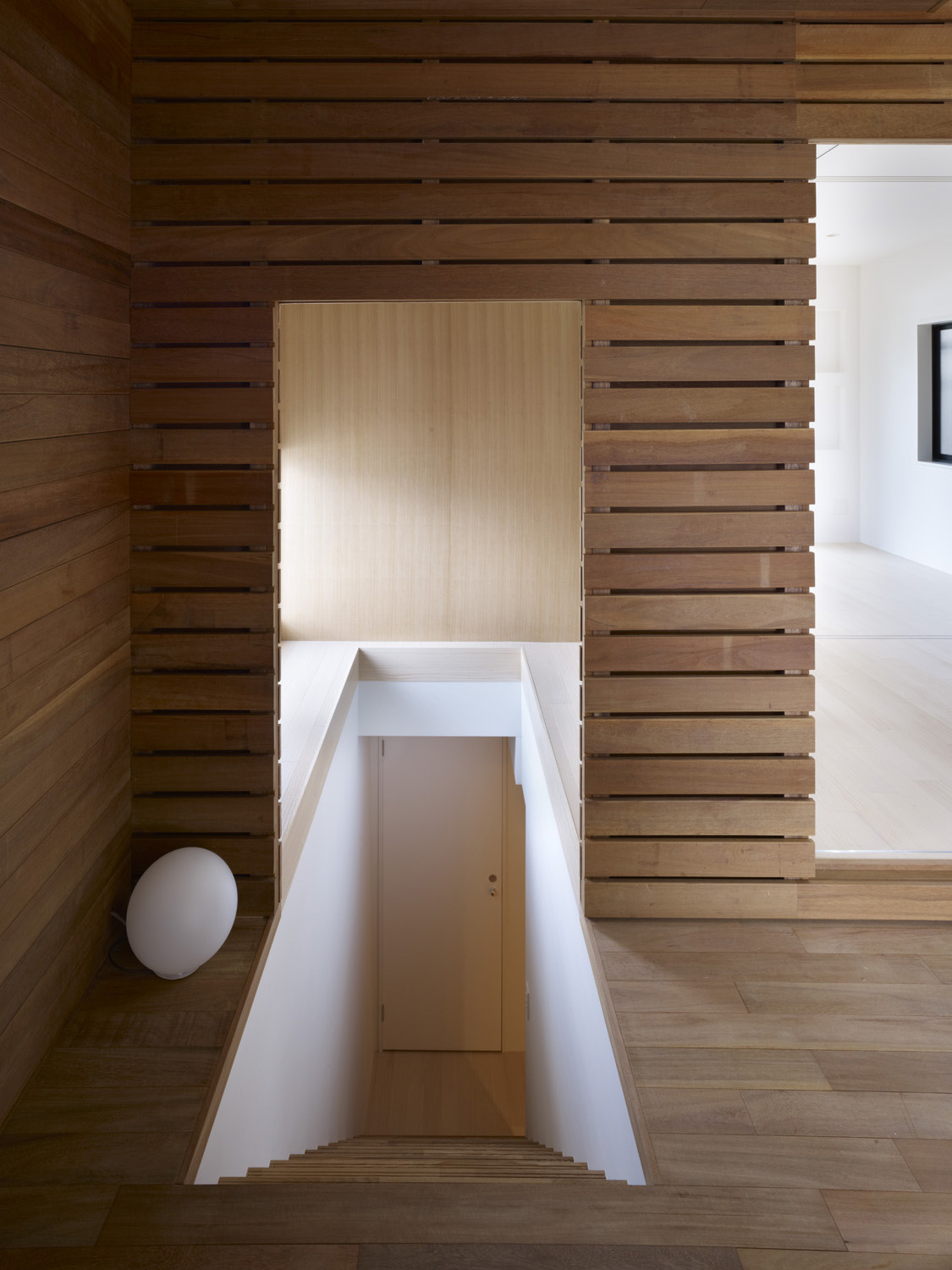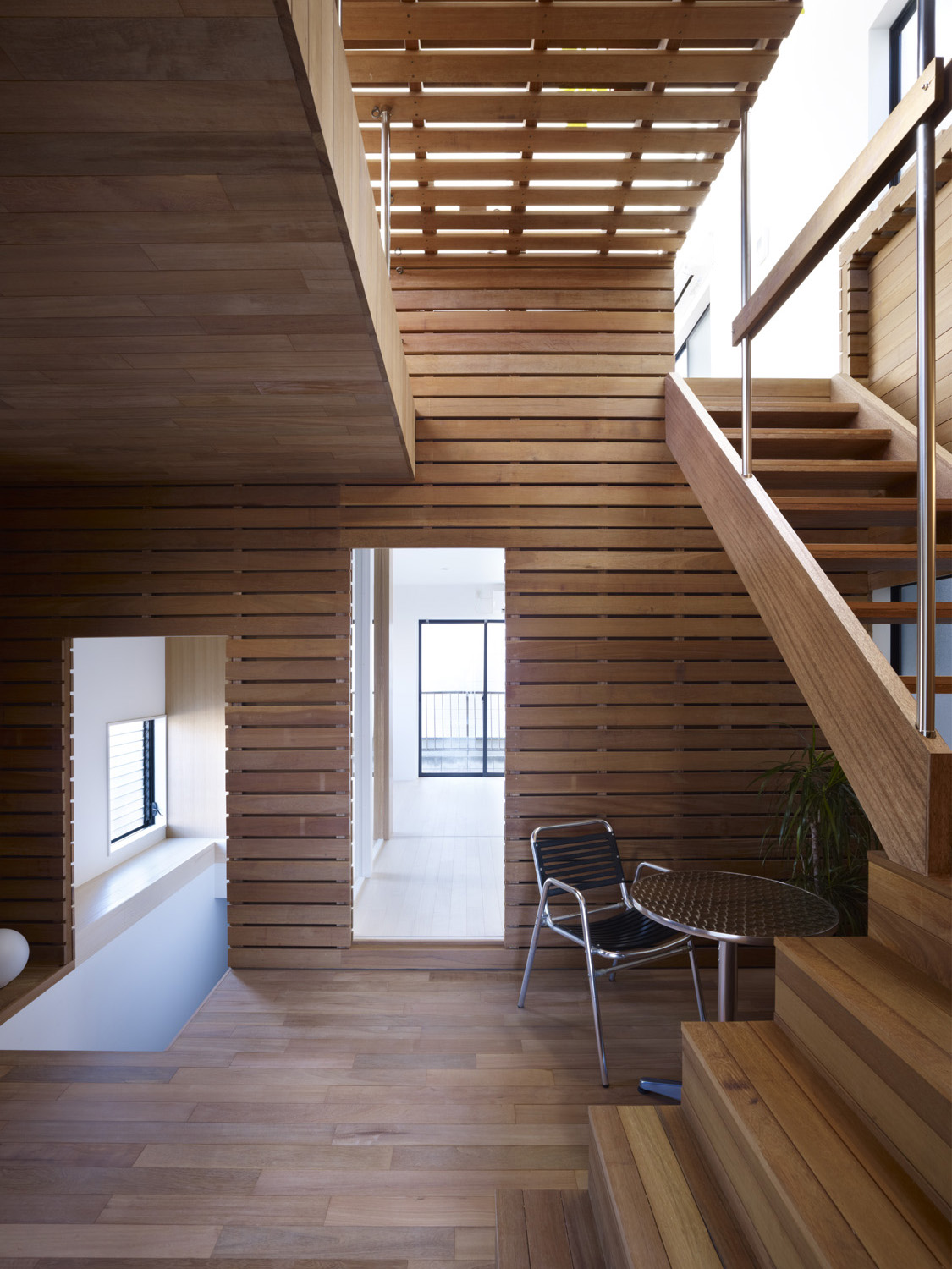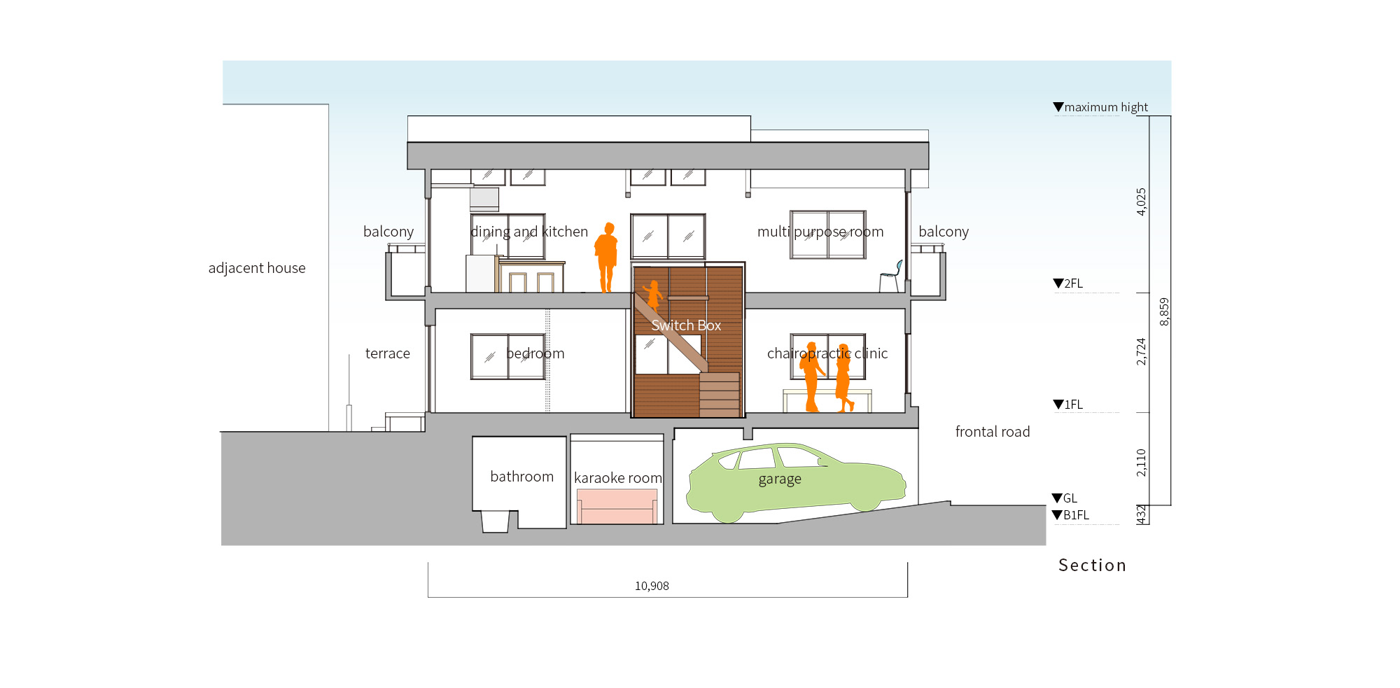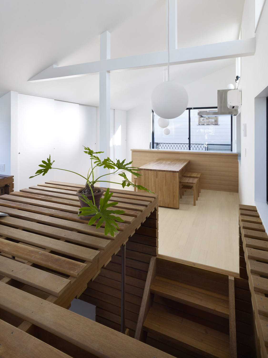 既存建物は築17年の一戸建て、ガレージ付き半地下コンクリートの上に木造2階の4LDK、さしあたり住むことはできるが、どういう経緯でその間取りになったのか分からない状態だった。 新しいオーナーは夫婦+子供の3人家族。建物中央にホールのような箱状の空間をつくり、そこから夫人が開設する治療院、夫婦の寝室、玄関ポーチ、上階のリビングダイニング、下階のカラオケ室、それぞれへの出入口を設けた。様々な用途の部屋を既存建物内に再配置して、住宅というより複合施設のような構成になった。各部屋間の動線をまとめて関係づける箱状の空間は、いわば間取りのスイッチボックスだ。 箱はデッキ材を使って目透かし張りで仕上げている。その天面には下階へ光が落ちるように大きめの隙間を開け、側面には視線を通さず声が聞こえる程度に小さめの隙間を開けた。2階から地下まで空間の緩やかな連続性をつくると同時に、来客時にはプライバシーが守られるように隙間を調整している。 2階のリビングダイニングでは、箱の天面を家事に適したカウンターの高さとしてあるが、頭上の勾配天井に沿ってハイサイド窓から陽が入るため、天面に上がればサンルームのようにも使える。デッキ材の隙間にフックを取り付けて、絵やハンガー、観葉植物を好きな所に掛けることもできる。屋外に庭がほとんどないので、箱を用いて室内でどれだけ多様な生活風景を展開できるか考えた。 改装前の中古住宅は、不動産市場に多く流通している典型的なものだった。今回は半地下コンクリートの防音性に着目してカラオケ室をつくったが、そういった特性を利用して新たな住環境を整える方法が他にも色々あるのではないかと、可能性を感じている。 -中佐昭夫- Name of the Project : Switch Box in House Switch Box in House This is a total interior renovation project of an existing house, installing a box made of deck lumber in the middle of the house. The existing house is 17 year-old, two-story, 4-bedroom wooden structure on top of semi-underground garage. It could serve as home, but we could not see how and for whom the room layout was made. New owner of the house is a family of three; a couple with a child. Installed in the center of the house is a hall-like space made by a large box which gives a doorway to chiropractic clinic run by the wife, to the bedroom of the couple, to the entrance of the house, to living and dining room upstairs, and to karaoke room in basement. As rooms of various purposes were relocated in the existing house, the composition of the house became more like that of a complex facility. The box-like space which brings together traffic lines and connects each room is, in a sense, switch box of traffic lines. The box is made of deck lumber, whose top side has large interspace between lumber and let sunlight pour downstairs. On the sides of the box are smaller interspaces to avoid the gaze but large enough to let through the voices. It allows loose spatial continuity from the second floor to the basement and at the same time, interspaces are adjusted to keep privacy when there are guests. In the living-dining room on the second floor, the top of the box comes up to the height of a counter suitable for housework. High side windows on the sloped ceiling take in ample sunshine and the top of the box can be used as sunroom. Hooks can be placed between the deck lumber to hang pictures, hangers or foliage plants anywhere we like. There is almost no exterior space for garden within the premises, and it was our challenge to introduce various living scenes indoors by using the box. The existing house before the renovation was one of many typical houses in the real estate market. In this renovation, we made Karaoke room in the basement, taking advantage of the sound insulation properties of concrete foundation. We see possibilities in creating new living environment by taking advantage of such properties. – Akio Nakasa – |
