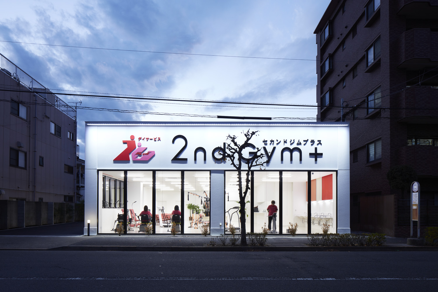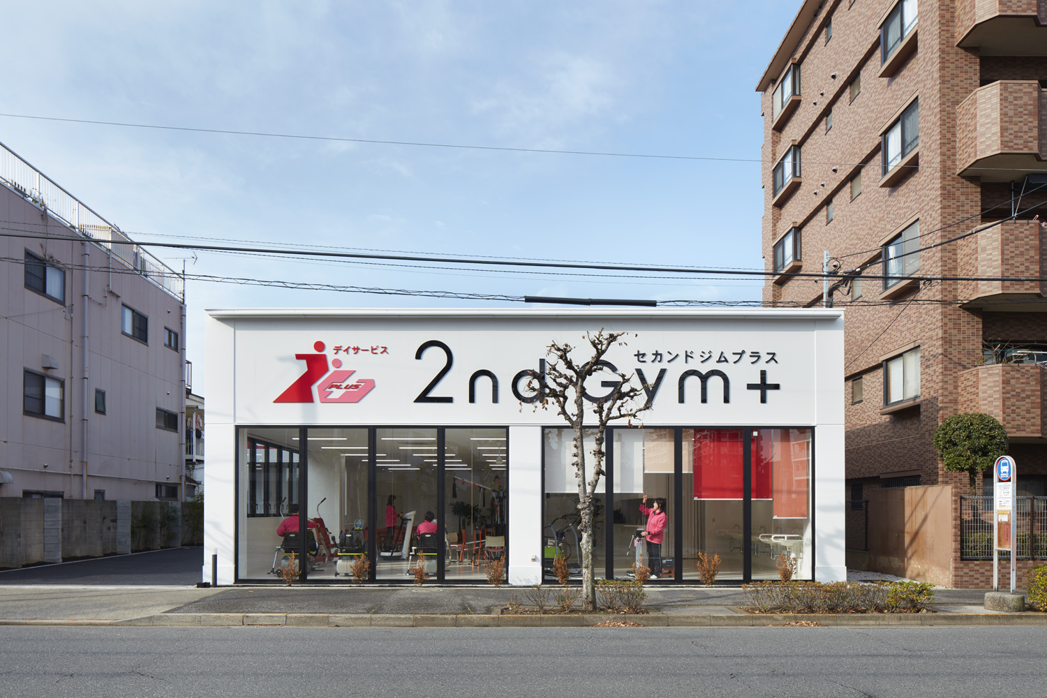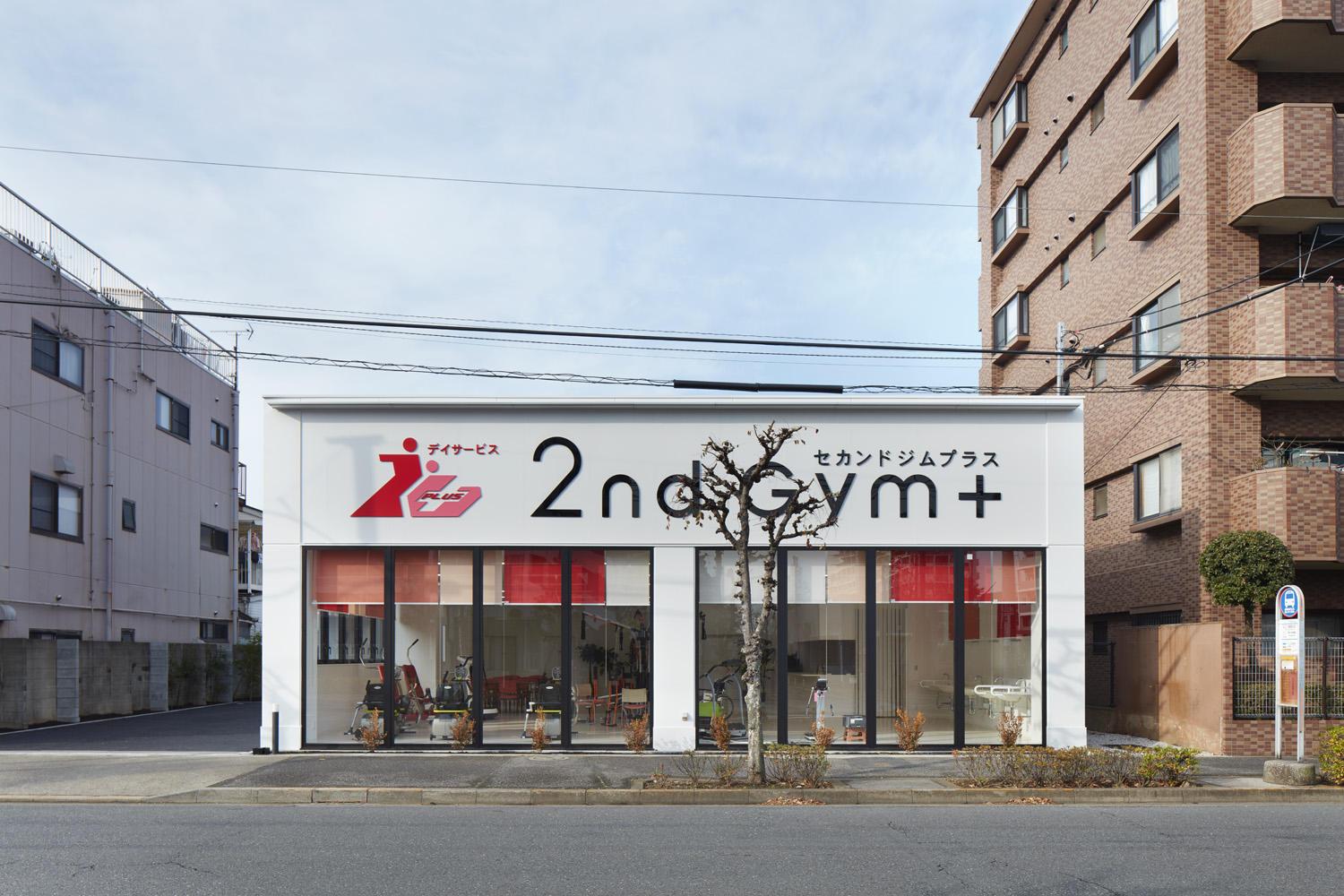 フィットネス活動に特徴があるデイサービス。送迎付きで、午前・午後ともにインストラクターがトレーニング指導を行い、食事や入浴もできるようになっている。 建物は平屋でシンプルな間取りとし、均等な割り付けの全面サッシュを大通りに向かって天井と間口いっぱいに設置し、そこにランダムな割り付けのロールスクリーンを追加した。色は「2ndGym+」のイメージカラーである赤のグラデーションとしている。 大通りの向かいには高層マンションの緑地帯があり、建物内部から見ると全面サッシュ越しに東に向かって視界が開けていて、フィットネスを気分良く行えるように、サッシュ付近に機能訓練の器具が配置されている。時間帯や季節によっては直射日光が差し込み、バス停のある大通りからの視線が気になるため、状況を見ながらロールスクリーンを上げ下げして居心地を調整する。営業が始まるとロールスクリーンが上がり、営業が終わると下がる。 デイサービスの利用には介護保険が必要で、65歳以上が対象年齢になる(65歳未満で対象になる場合もある)。総務省によれば、2017年9月の段階で総人口に占める65歳以上の高齢者の割合が27.7%に達し、世界でもっとも高いとされている。 これからさらに高齢者の増加が見込まれており、デイサービスも多様化の過程にあるが、中でも「2ndGym+」においては、できるだけ身体の健康を維持したいという要望へ直接的に応えることに重きが置かれている。 建物外部から全面サッシュ越しに見える利用者の活動と、赤いロールスクリーンの動きによって、このデイサービスの特徴を端的に表現できればと考えた。 -中佐昭夫- |