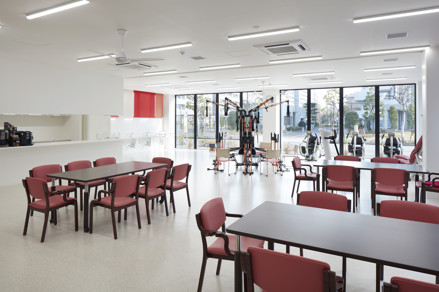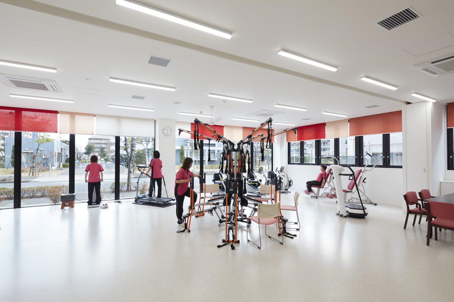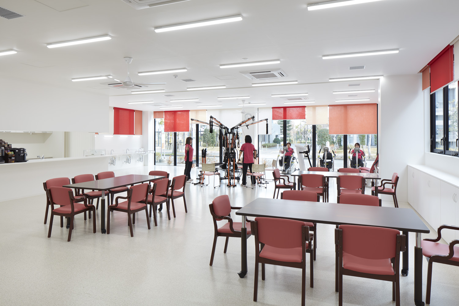 フィットネス活動に特徴があるデイサービス。送迎付きで、午前・午後ともにインストラクターがトレーニング指導を行い、食事や入浴もできるようになっている。 建物は平屋でシンプルな間取りとし、均等な割り付けの全面サッシュを大通りに向かって天井と間口いっぱいに設置し、そこにランダムな割り付けのロールスクリーンを追加した。色は「2ndGym+」のイメージカラーである赤のグラデーションとしている。 大通りの向かいには高層マンションの緑地帯があり、建物内部から見ると全面サッシュ越しに東に向かって視界が開けていて、フィットネスを気分良く行えるように、サッシュ付近に機能訓練の器具が配置されている。時間帯や季節によっては直射日光が差し込み、バス停のある大通りからの視線が気になるため、状況を見ながらロールスクリーンを上げ下げして居心地を調整する。営業が始まるとロールスクリーンが上がり、営業が終わると下がる。 デイサービスの利用には介護保険が必要で、65歳以上が対象年齢になる(65歳未満で対象になる場合もある)。総務省によれば、2017年9月の段階で総人口に占める65歳以上の高齢者の割合が27.7%に達し、世界でもっとも高いとされている。 これからさらに高齢者の増加が見込まれており、デイサービスも多様化の過程にあるが、中でも「2ndGym+」においては、できるだけ身体の健康を維持したいという要望へ直接的に応えることに重きが置かれている。 建物外部から全面サッシュ越しに見える利用者の活動と、赤いロールスクリーンの動きによって、このデイサービスの特徴を端的に表現できればと考えた。 -中佐昭夫- |