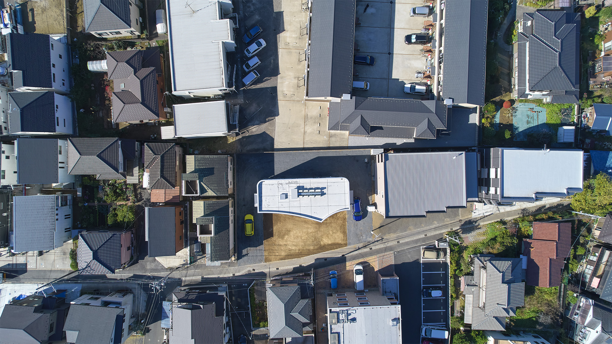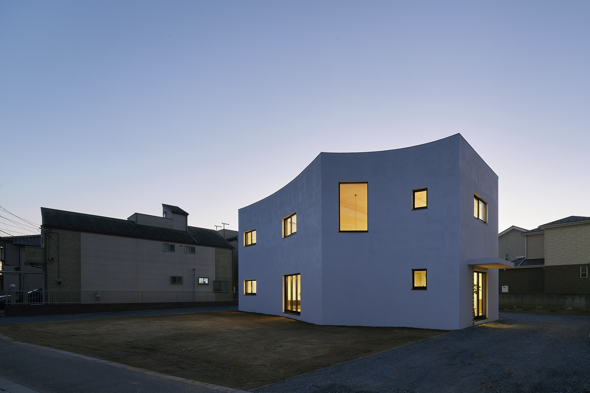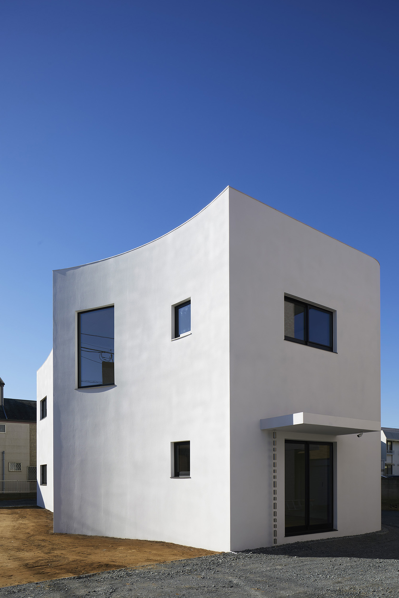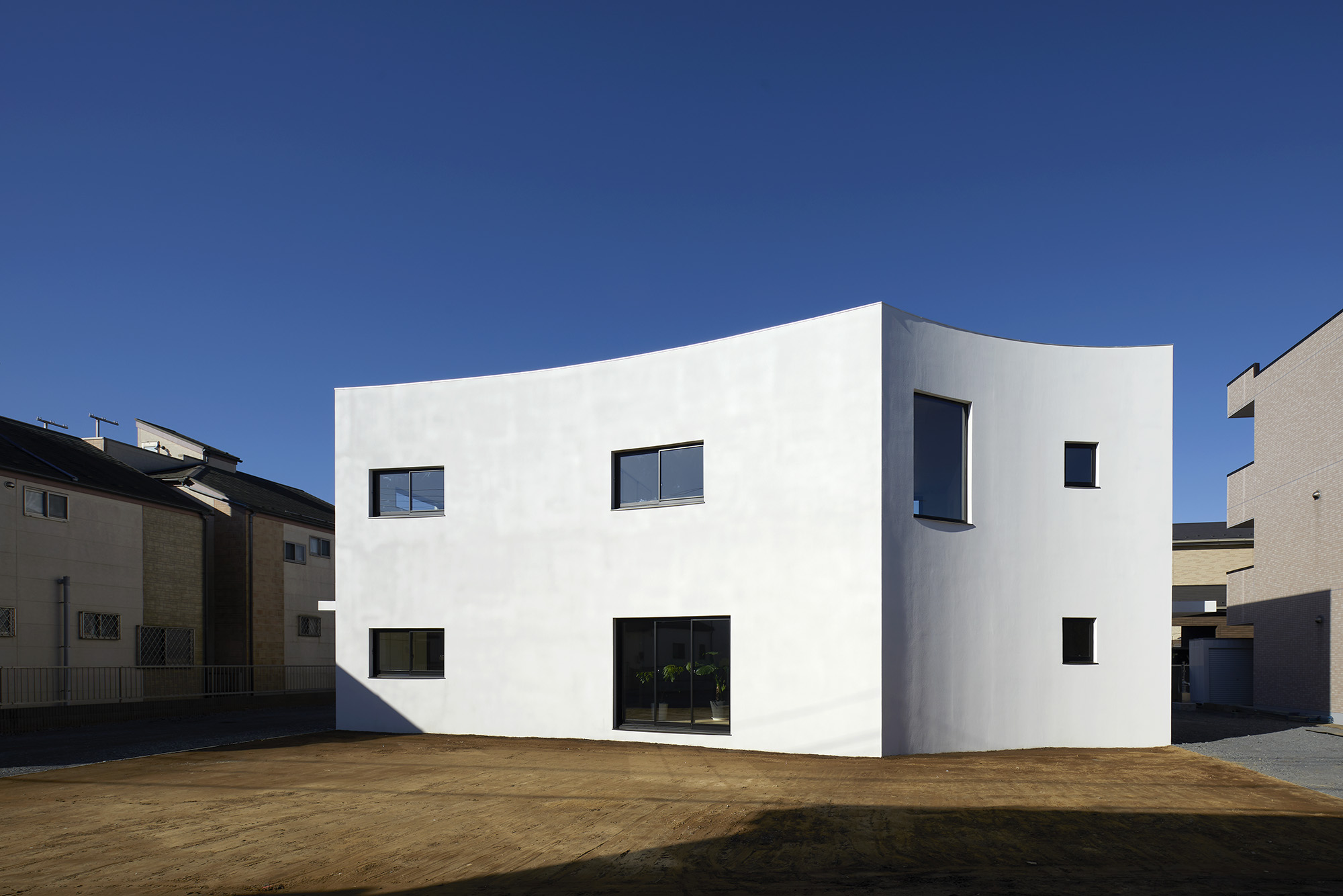 周りに道をぐるりと巡らせた住宅。 敷地は千葉市の郊外で、約500平米と十分な広さがある。しかし前面道路は車1台がちょうど通れる程度の幅しかなく、敷地の前を通り過ぎた先でさらに狭まるので路上では向きが変えられない。車が主な移動手段の地域においては、少々不便な状況だった。 敷地の広さを生かして車が転回できるようにすれば、来た道を楽に戻ってゆける。このことから、住宅の周りに道を巡らせる配置計画を考え始めた。 建主は複数の企業を経営していて、音楽や車を趣味とし、かつてアパレルブランドでデザイナーを務めていた経緯がある。その奥様は植物に囲まれた生活を望んでいて、かつて介護関係の仕事についていた経緯がある。現在・過去も含めて、そういった多様なバックグラウンドに基づく新居への要望は色々とあったが、今回の配置計画によってそれらを集約的に実現できるのではないか、とも考えた。 たとえば1階には、道に面して南側に打ち合わせスペースを兼ねた広い玄関、北側に掃き出し窓から出入りできる客間をつくっている。これは「銀行や関係先企業への対応は玄関で済ませたい」「将来に高齢の親を客間に迎える際は外部からの動線が短い方がいい」といった要望に対し、車が通れる道を巡らせることでシンプルに応えようとしたものだ。それぞれの出入口の上部には雨に濡れないように庇を設けた。 2階には建主と奥様の主寝室のほか、子供達のための個室があり、1階とは吹き抜けを介して双方の気配がそれとなく伝わる構成としている。 道は60mの長さがあり、車での通行に十分な5mの幅をもたせて、曲がりやすいようにコーナーは丸めてある。ひとまずは砕石を敷いているが、様々な木や花を植えたり、舗装材や縁石で仕上げたり、これから建主と奥様が時間をかけて楽しみながらデザインしてゆくためのフィールドになっている。 前面道路と住宅の間には、土のままの庭がある。東に向かって日当たりが良いが、正面には近隣住宅が並んでいる。したがって住宅の外壁をつまんだような凸型に変形して近隣との視線の正対を避けるようにしながら、LDKと客間の広さを確保した。庭は凸型の頂点から南側と北側のゾーンに大別してあり、将来はLDKから直接出られる南側に芝生、北側にはガレージなどが予定されている。 外壁は直線と曲線を組み合わせた構成になっていて、道を巡ると東西南北に様々なファサードが現れる。視点の移動に伴ってファサードが変化しても、一定の印象や安定感、量感を持たせるために、外壁の下端から上端まで目地を入れないRC壁式造とし、白い塗装と黒いサッシュで統一している。 竣工後、さっそく道や庭の計画が始まった。きっと緑あふれる賑やかな場へと育ってゆくに違いない。 -中佐昭夫- Name of the Project : House with a Road Around House with a wrap-around road. The land in a suburb of Chiba city is large enough for a house, approx. 500 sqm, but frontal road which is narrowing further down the road is only wide just enough for a car which does not allow a car to make a U-turn. In an area where cars are the main means of transportation, this was inconvenient. The layout plan started with a wrap-around road which allows easy turn around for cars, making the most of large land. The client runs several companies, enjoys music and cars, and have worked as a designer at a fashion brand. His spouse has worked in nursing care industry and wanted a life with green. There were many qualities desired for the new house deriving from past and current profession and hobbies, and the layout plan was to satisfy and respond comprehensively their wish list. On the first floor has a wide entrance with a meeting space in the south and a living room with patio doors in the north. This layout of wrap-around road was to satisfy the requests such as, business affairs to be dealt at the entrance and short traffic line for elderly parents to come inside. Both entrances have eaves to avoid rain. On the second floor is a master bedroom for client couple, bedrooms for children and double ceiling in the middle to feel a presence of first floor. The road is 60 m long, 5 m width with round corners, and paved with crushed stones for the time being. It may be paved with different paving material and edge stones, and planted with various trees and floors, serving as a field to be designed by the client over time. Between the frontal road and the house is a barren garden. Sunny lot is facing east and adjacent houses in front. Thus the house façade is curved from both ends to form a peak to avoid direct contact from adjacent houses while securing enough space in the living/ dining and guest living room. The garden will be divided from the peak of curved wall by the south and north zone; south zone facing the living/ dining room will be covered by lawn, north zone to be garage. Exterior wall is a combination of straight and curved line, giving façade different impressions as you go around the road in all four directions. To give constant and stable impression, the building is made of reinforced concrete with no joints on the white paint and black sash wall. After the completion, the client set to work on the road and garden. The project will soon transform to be a green and bustling place. – Akio Nakasa – |