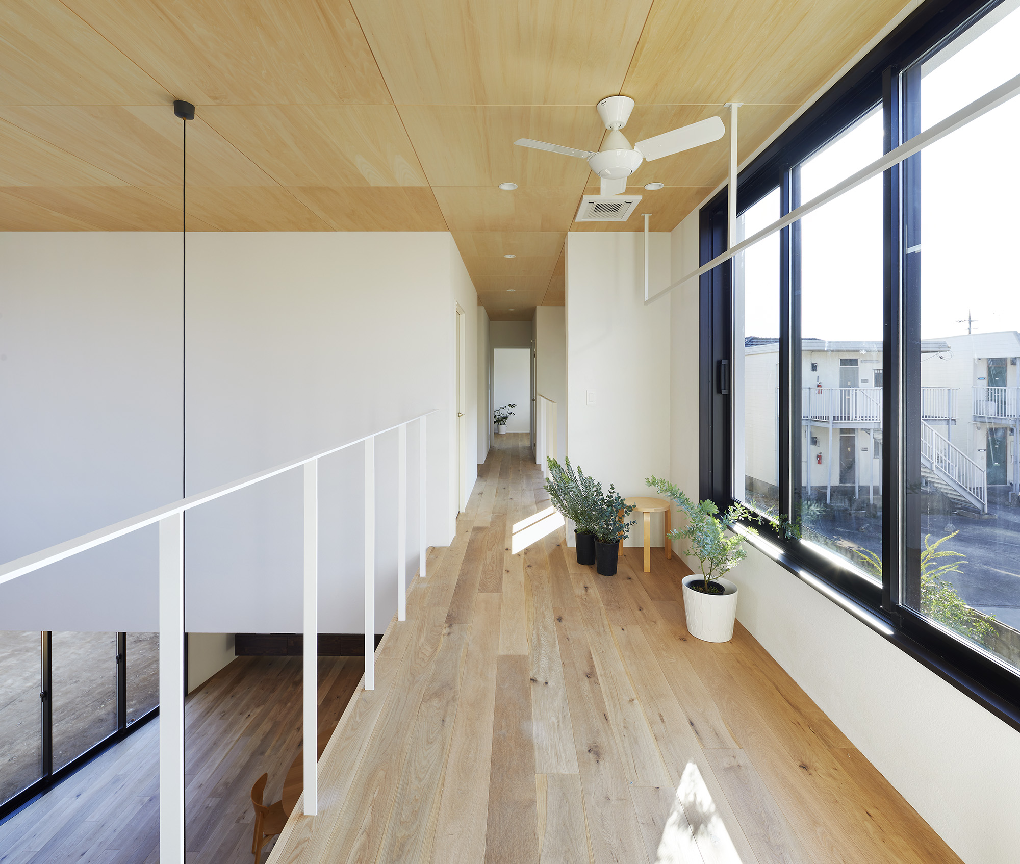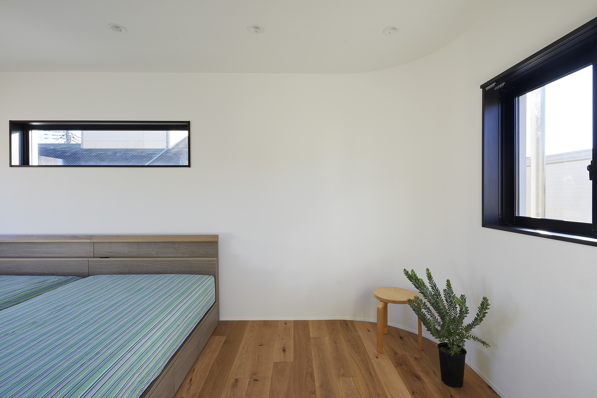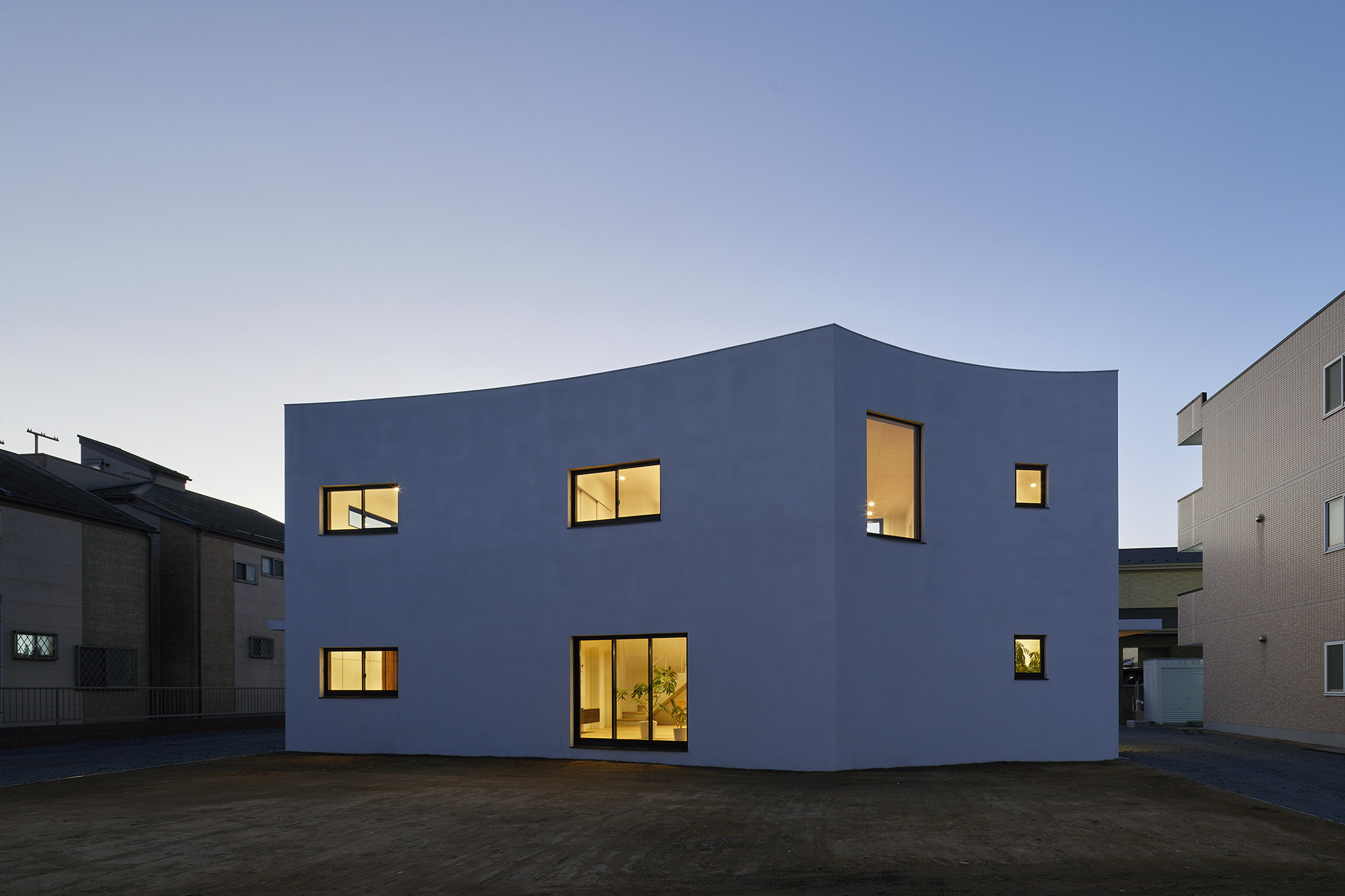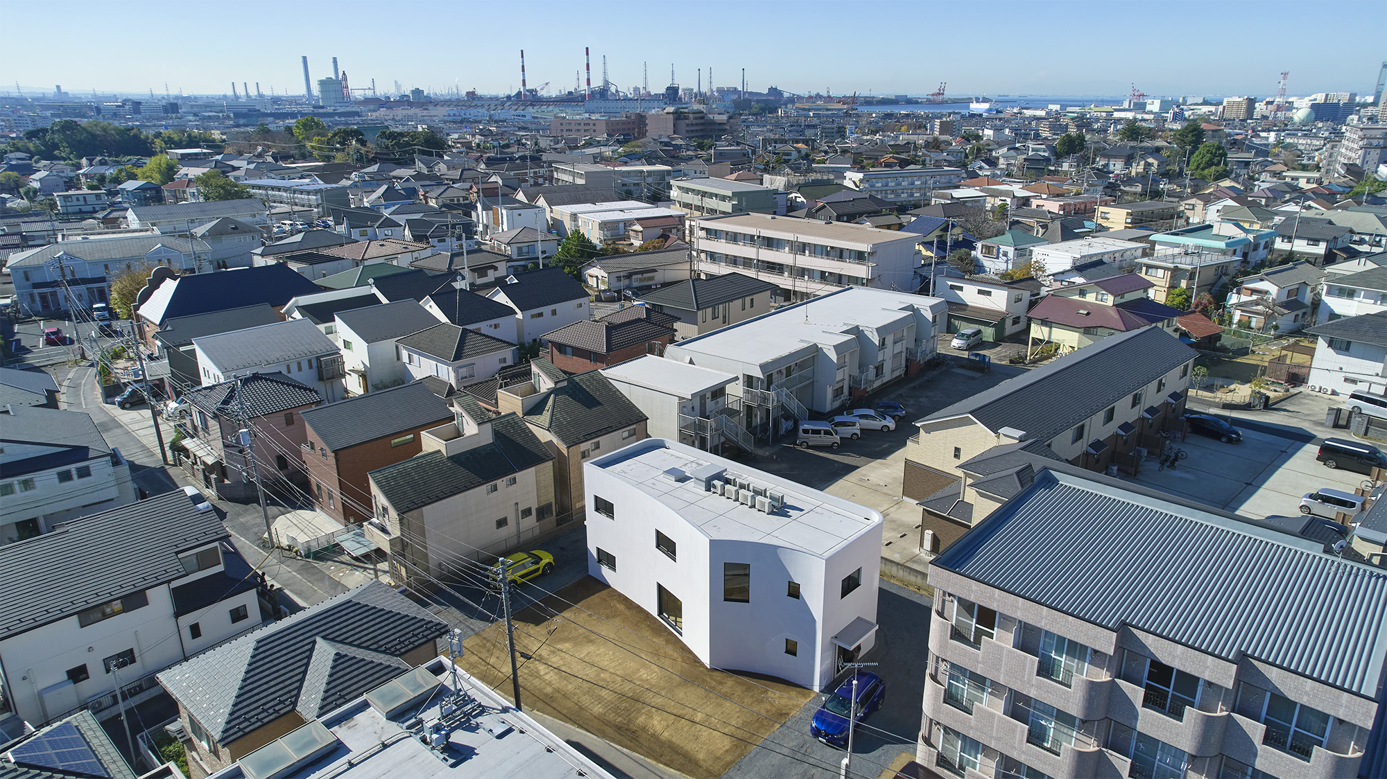 周りに道をぐるりと巡らせた住宅。 敷地は千葉市の郊外で、約500平米と十分な広さがある。しかし前面道路は車1台がちょうど通れる程度の幅しかなく、敷地の前を通り過ぎた先でさらに狭まるので路上では向きが変えられない。車が主な移動手段の地域においては、少々不便な状況だった。 敷地の広さを生かして車が転回できるようにすれば、来た道を楽に戻ってゆける。このことから、住宅の周りに道を巡らせる配置計画を考え始めた。 建主は複数の企業を経営していて、音楽や車を趣味とし、かつてアパレルブランドでデザイナーを務めていた経緯がある。その奥様は植物に囲まれた生活を望んでいて、かつて介護関係の仕事についていた経緯がある。現在・過去も含めて、そういった多様なバックグラウンドに基づく新居への要望は色々とあったが、今回の配置計画によってそれらを集約的に実現できるのではないか、とも考えた。 たとえば1階には、道に面して南側に打ち合わせスペースを兼ねた広い玄関、北側に掃き出し窓から出入りできる客間をつくっている。これは「銀行や関係先企業への対応は玄関で済ませたい」「将来に高齢の親を客間に迎える際は外部からの動線が短い方がいい」といった要望に対し、車が通れる道を巡らせることでシンプルに応えようとしたものだ。それぞれの出入口の上部には雨に濡れないように庇を設けた。 2階には建主と奥様の主寝室のほか、子供達のための個室があり、1階とは吹き抜けを介して双方の気配がそれとなく伝わる構成としている。 道は60mの長さがあり、車での通行に十分な5mの幅をもたせて、曲がりやすいようにコーナーは丸めてある。ひとまずは砕石を敷いているが、様々な木や花を植えたり、舗装材や縁石で仕上げたり、これから建主と奥様が時間をかけて楽しみながらデザインしてゆくためのフィールドになっている。 前面道路と住宅の間には、土のままの庭がある。東に向かって日当たりが良いが、正面には近隣住宅が並んでいる。したがって住宅の外壁をつまんだような凸型に変形して近隣との視線の正対を避けるようにしながら、LDKと客間の広さを確保した。庭は凸型の頂点から南側と北側のゾーンに大別してあり、将来はLDKから直接出られる南側に芝生、北側にはガレージなどが予定されている。 外壁は直線と曲線を組み合わせた構成になっていて、道を巡ると東西南北に様々なファサードが現れる。視点の移動に伴ってファサードが変化しても、一定の印象や安定感、量感を持たせるために、外壁の下端から上端まで目地を入れないRC壁式造とし、白い塗装と黒いサッシュで統一している。 竣工後、さっそく道や庭の計画が始まった。きっと緑あふれる賑やかな場へと育ってゆくに違いない。 -中佐昭夫- Name of the Project : House with a Road Around House with a wrap-around road. The land in a suburb of Chiba city is large enough for a house, approx. 500 sqm, but frontal road which is narrowing further down the road is only wide just enough for a car which does not allow a car to make a U-turn. In an area where cars are the main means of transportation, this was inconvenient. The layout plan started with a wrap-around road which allows easy turn around for cars, making the most of large land. The client runs several companies, enjoys music and cars, and have worked as a designer at a fashion brand. His spouse has worked in nursing care industry and wanted a life with green. There were many qualities desired for the new house deriving from past and current profession and hobbies, and the layout plan was to satisfy and respond comprehensively their wish list. On the first floor has a wide entrance with a meeting space in the south and a living room with patio doors in the north. This layout of wrap-around road was to satisfy the requests such as, business affairs to be dealt at the entrance and short traffic line for elderly parents to come inside. Both entrances have eaves to avoid rain. On the second floor is a master bedroom for client couple, bedrooms for children and double ceiling in the middle to feel a presence of first floor. The road is 60 m long, 5 m width with round corners, and paved with crushed stones for the time being. It may be paved with different paving material and edge stones, and planted with various trees and floors, serving as a field to be designed by the client over time. Between the frontal road and the house is a barren garden. Sunny lot is facing east and adjacent houses in front. Thus the house façade is curved from both ends to form a peak to avoid direct contact from adjacent houses while securing enough space in the living/ dining and guest living room. The garden will be divided from the peak of curved wall by the south and north zone; south zone facing the living/ dining room will be covered by lawn, north zone to be garage. Exterior wall is a combination of straight and curved line, giving façade different impressions as you go around the road in all four directions. To give constant and stable impression, the building is made of reinforced concrete with no joints on the white paint and black sash wall. After the completion, the client set to work on the road and garden. The project will soon transform to be a green and bustling place. – Akio Nakasa – |