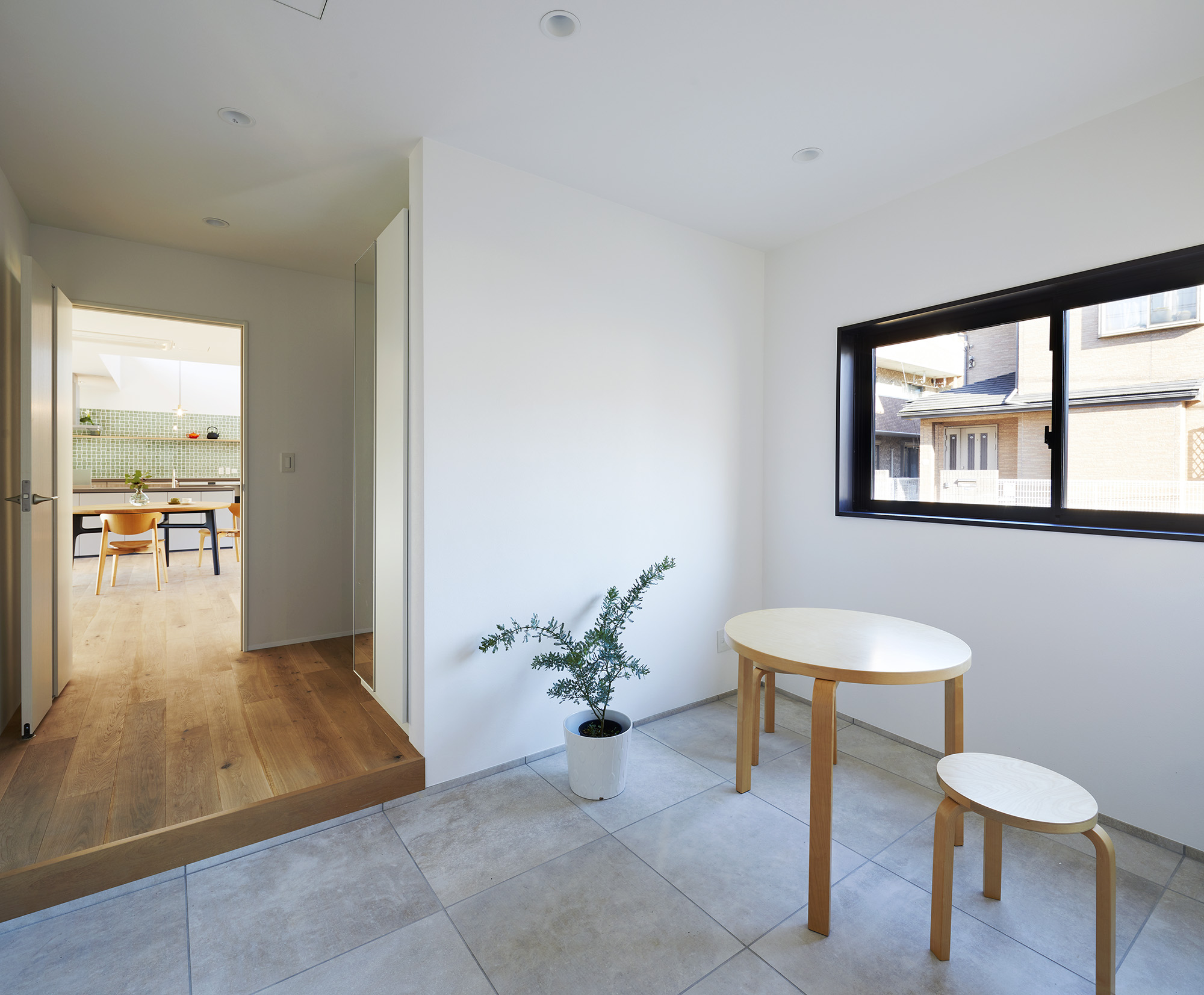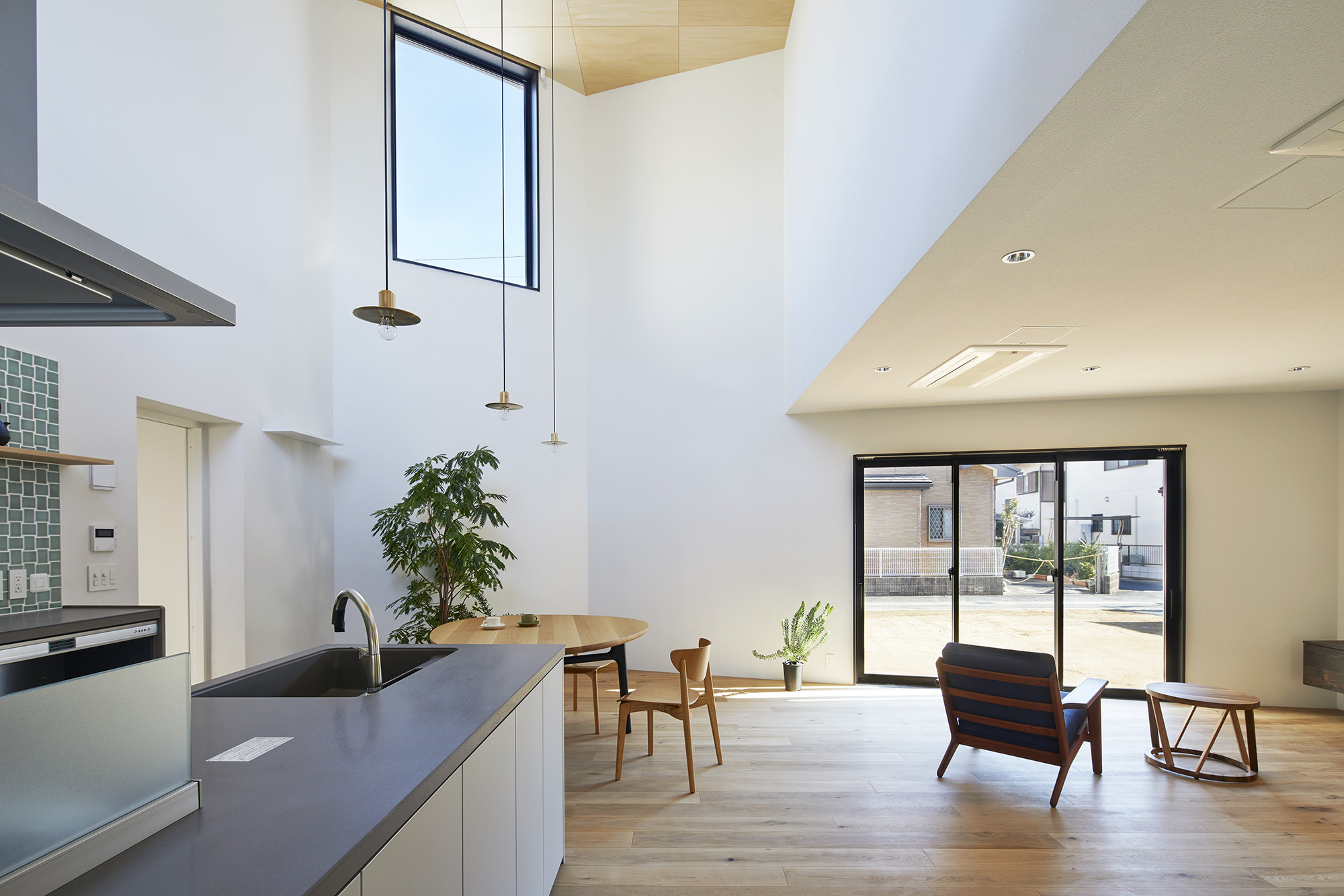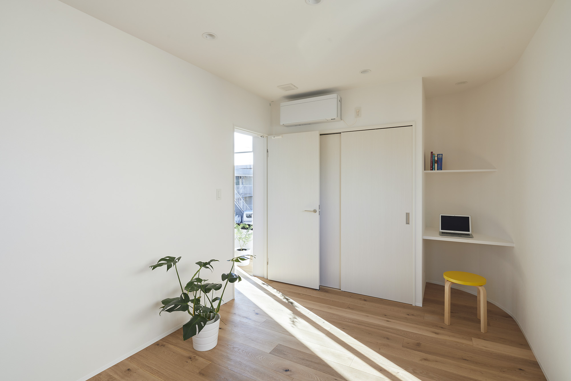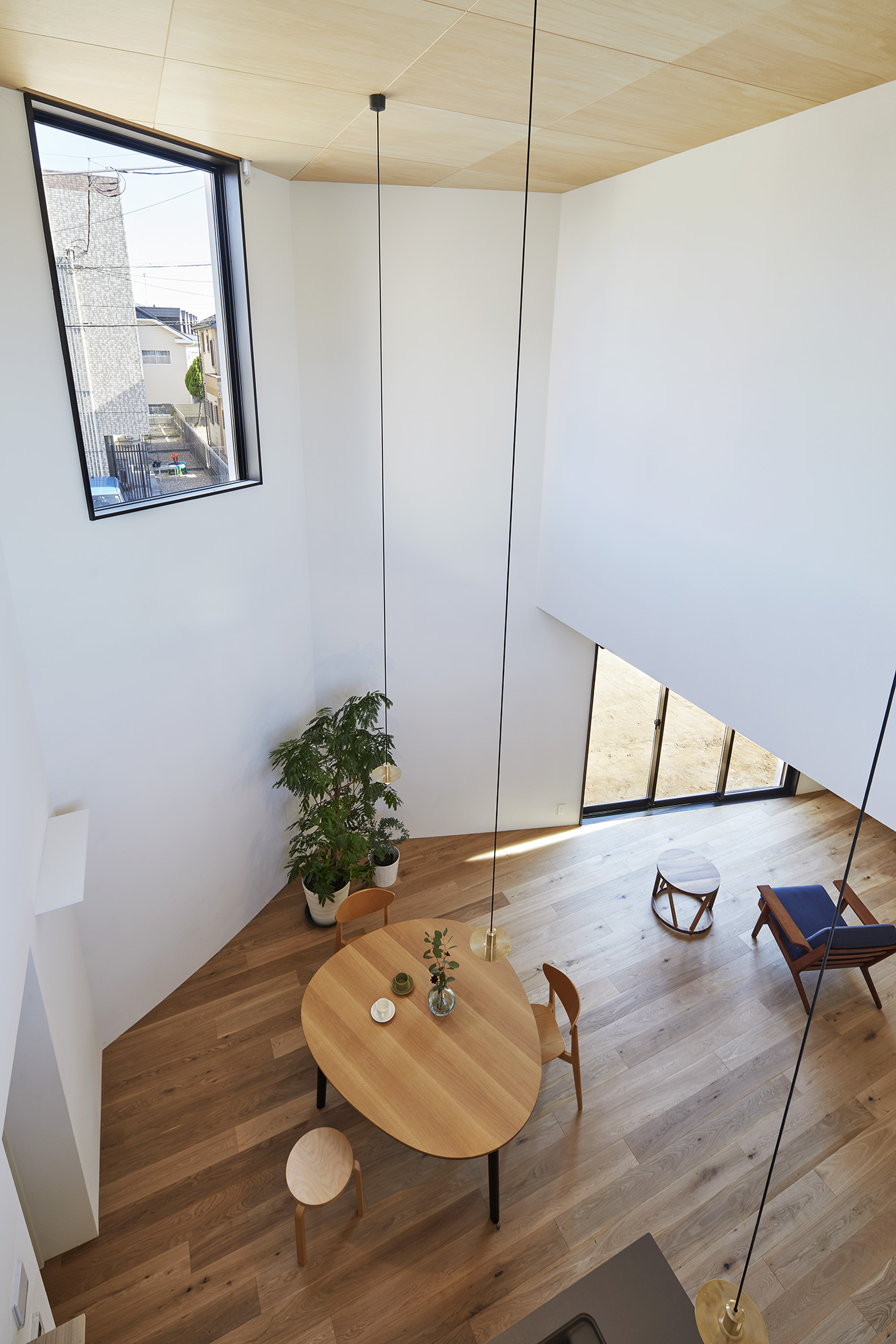 周りに道をぐるりと巡らせた住宅。 敷地は千葉市の郊外で、約500平米と十分な広さがある。しかし前面道路は車1台がちょうど通れる程度の幅しかなく、敷地の前を通り過ぎた先でさらに狭まるので路上では向きが変えられない。車が主な移動手段の地域においては、少々不便な状況だった。 敷地の広さを生かして車が転回できるようにすれば、来た道を楽に戻ってゆける。このことから、住宅の周りに道を巡らせる配置計画を考え始めた。 建主は複数の企業を経営していて、音楽や車を趣味とし、かつてアパレルブランドでデザイナーを務めていた経緯がある。その奥様は植物に囲まれた生活を望んでいて、かつて介護関係の仕事についていた経緯がある。現在・過去も含めて、そういった多様なバックグラウンドに基づく新居への要望は色々とあったが、今回の配置計画によってそれらを集約的に実現できるのではないか、とも考えた。 たとえば1階には、道に面して南側に打ち合わせスペースを兼ねた広い玄関、北側に掃き出し窓から出入りできる客間をつくっている。これは「銀行や関係先企業への対応は玄関で済ませたい」「将来に高齢の親を客間に迎える際は外部からの動線が短い方がいい」といった要望に対し、車が通れる道を巡らせることでシンプルに応えようとしたものだ。それぞれの出入口の上部には雨に濡れないように庇を設けた。 2階には建主と奥様の主寝室のほか、子供達のための個室があり、1階とは吹き抜けを介して双方の気配がそれとなく伝わる構成としている。 道は60mの長さがあり、車での通行に十分な5mの幅をもたせて、曲がりやすいようにコーナーは丸めてある。ひとまずは砕石を敷いているが、様々な木や花を植えたり、舗装材や縁石で仕上げたり、これから建主と奥様が時間をかけて楽しみながらデザインしてゆくためのフィールドになっている。 前面道路と住宅の間には、土のままの庭がある。東に向かって日当たりが良いが、正面には近隣住宅が並んでいる。したがって住宅の外壁をつまんだような凸型に変形して近隣との視線の正対を避けるようにしながら、LDKと客間の広さを確保した。庭は凸型の頂点から南側と北側のゾーンに大別してあり、将来はLDKから直接出られる南側に芝生、北側にはガレージなどが予定されている。 外壁は直線と曲線を組み合わせた構成になっていて、道を巡ると東西南北に様々なファサードが現れる。視点の移動に伴ってファサードが変化しても、一定の印象や安定感、量感を持たせるために、外壁の下端から上端まで目地を入れないRC壁式造とし、白い塗装と黒いサッシュで統一している。 竣工後、さっそく道や庭の計画が始まった。きっと緑あふれる賑やかな場へと育ってゆくに違いない。 -中佐昭夫- Name of the Project : House with a Road Around House with a wrap-around road. The land in a suburb of Chiba city is large enough for a house, approx. 500 sqm, but frontal road which is narrowing further down the road is only wide just enough for a car which does not allow a car to make a U-turn. In an area where cars are the main means of transportation, this was inconvenient. The layout plan started with a wrap-around road which allows easy turn around for cars, making the most of large land. The client runs several companies, enjoys music and cars, and have worked as a designer at a fashion brand. His spouse has worked in nursing care industry and wanted a life with green. There were many qualities desired for the new house deriving from past and current profession and hobbies, and the layout plan was to satisfy and respond comprehensively their wish list. On the first floor has a wide entrance with a meeting space in the south and a living room with patio doors in the north. This layout of wrap-around road was to satisfy the requests such as, business affairs to be dealt at the entrance and short traffic line for elderly parents to come inside. Both entrances have eaves to avoid rain. On the second floor is a master bedroom for client couple, bedrooms for children and double ceiling in the middle to feel a presence of first floor. The road is 60 m long, 5 m width with round corners, and paved with crushed stones for the time being. It may be paved with different paving material and edge stones, and planted with various trees and floors, serving as a field to be designed by the client over time. Between the frontal road and the house is a barren garden. Sunny lot is facing east and adjacent houses in front. Thus the house façade is curved from both ends to form a peak to avoid direct contact from adjacent houses while securing enough space in the living/ dining and guest living room. The garden will be divided from the peak of curved wall by the south and north zone; south zone facing the living/ dining room will be covered by lawn, north zone to be garage. Exterior wall is a combination of straight and curved line, giving façade different impressions as you go around the road in all four directions. To give constant and stable impression, the building is made of reinforced concrete with no joints on the white paint and black sash wall. After the completion, the client set to work on the road and garden. The project will soon transform to be a green and bustling place. – Akio Nakasa – |