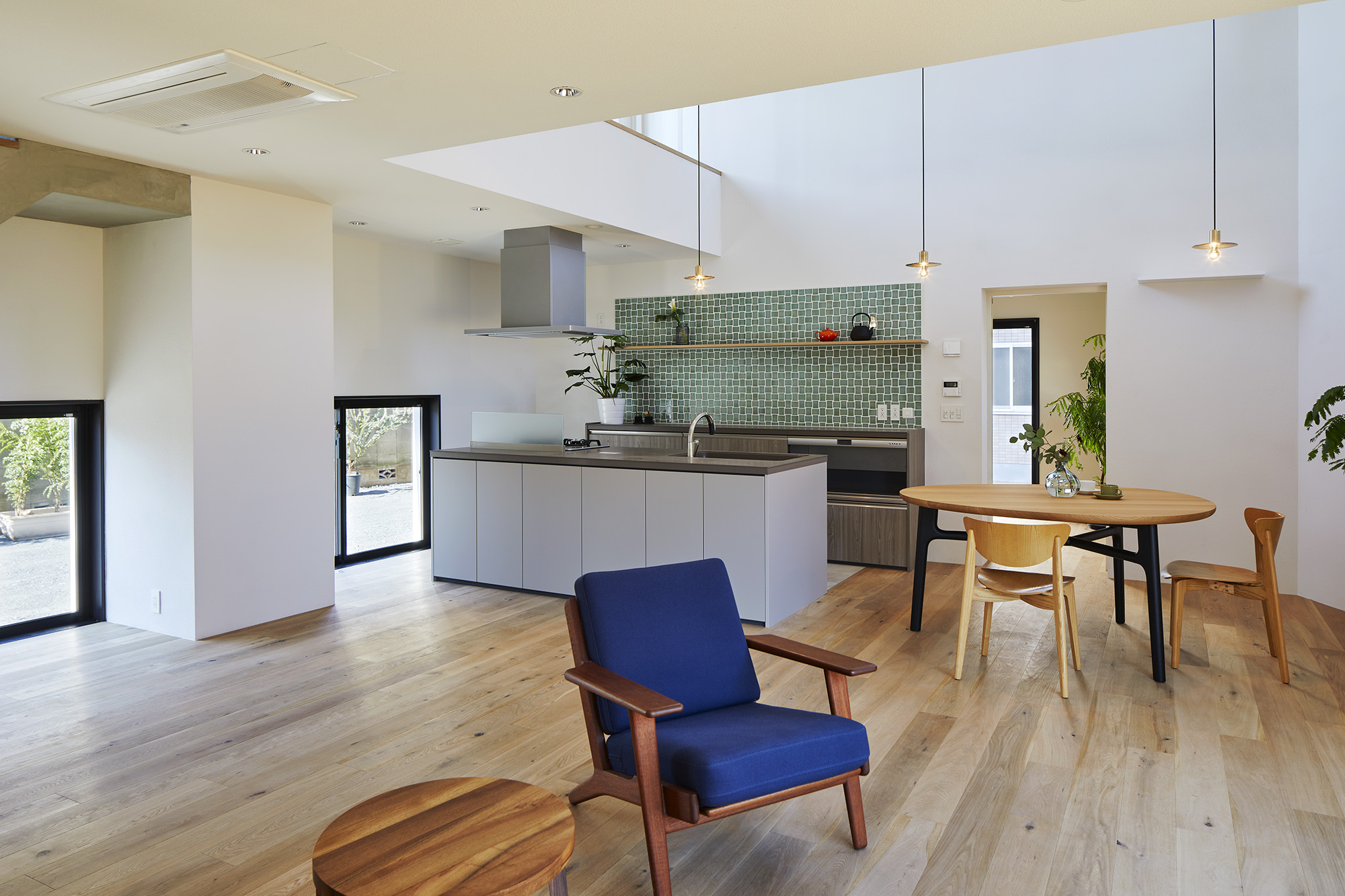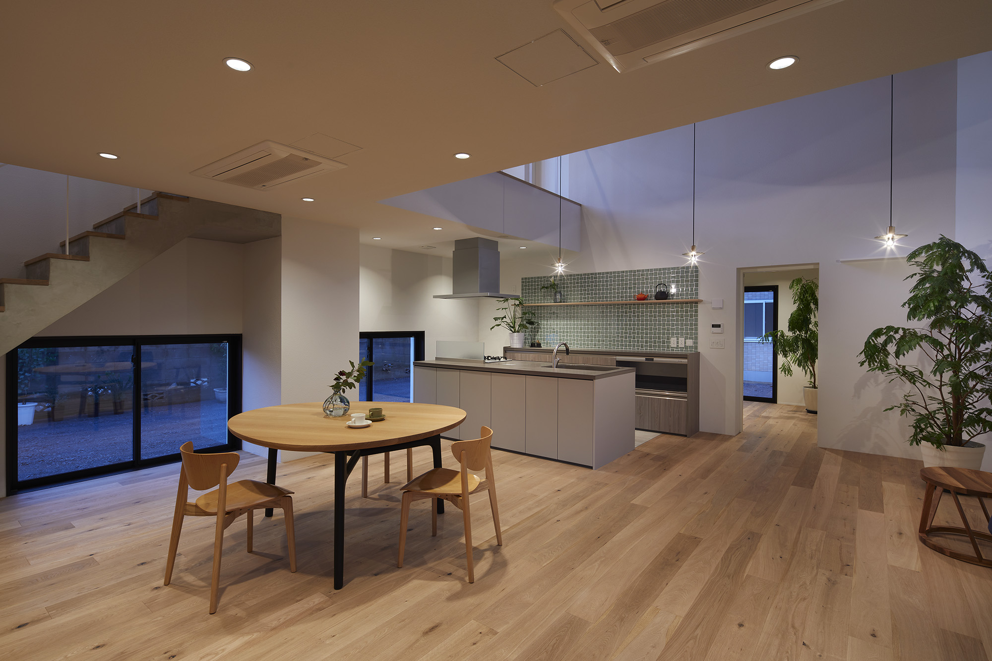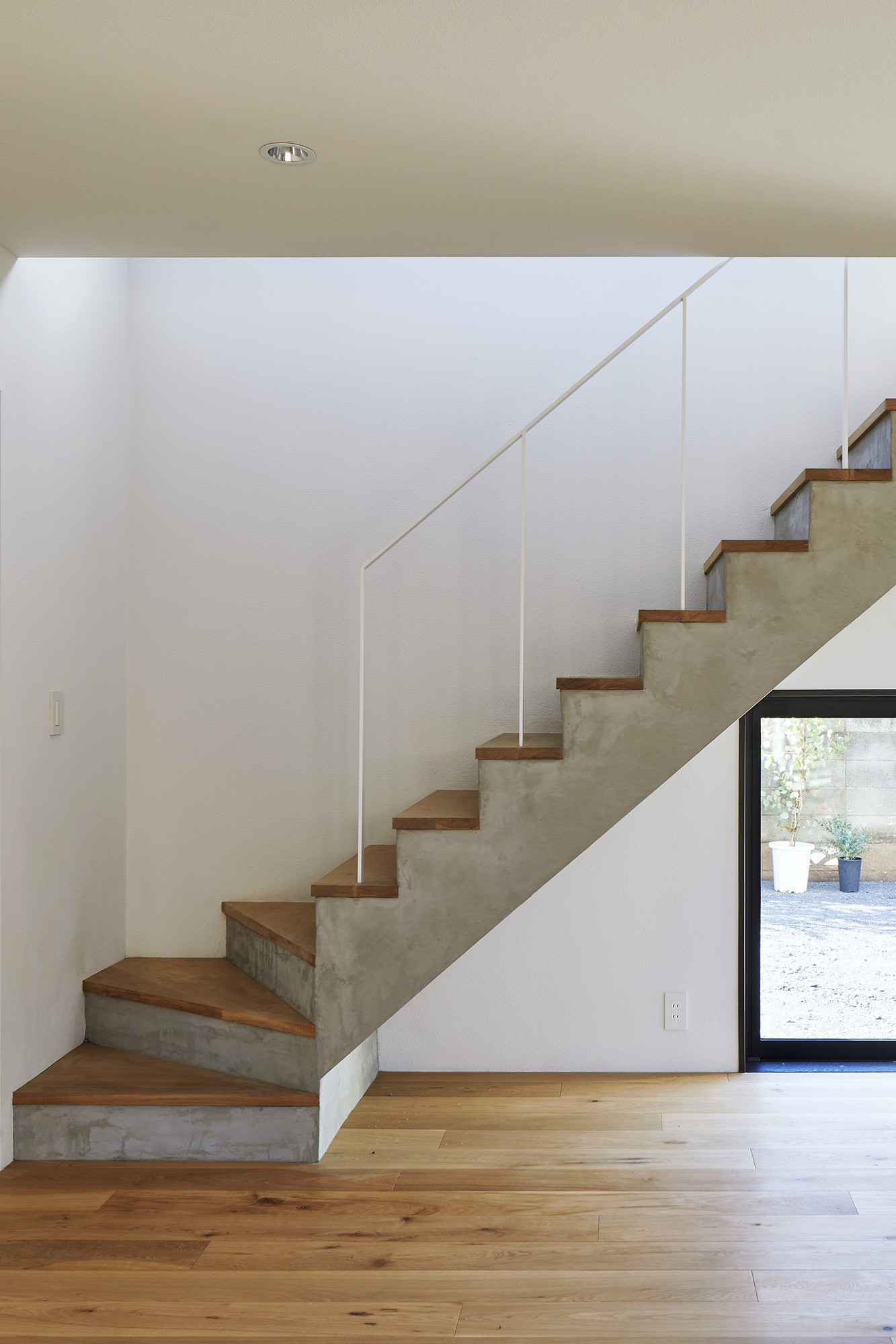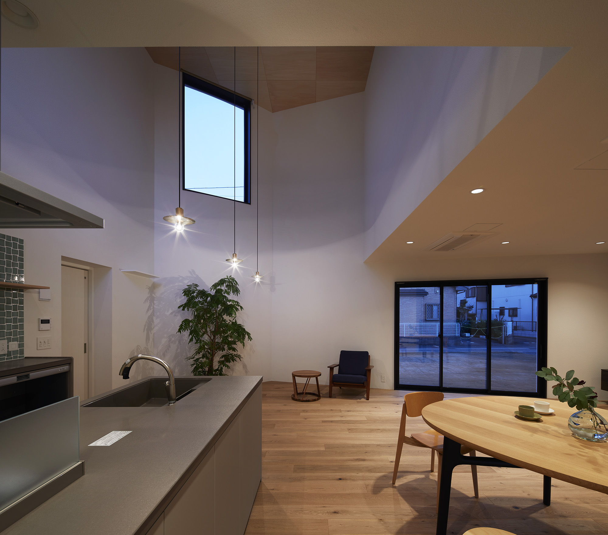 周りに道をぐるりと巡らせた住宅。 敷地は千葉市の郊外で、約500平米と十分な広さがある。しかし前面道路は車1台がちょうど通れる程度の幅しかなく、敷地の前を通り過ぎた先でさらに狭まるので路上では向きが変えられない。車が主な移動手段の地域においては、少々不便な状況だった。 敷地の広さを生かして車が転回できるようにすれば、来た道を楽に戻ってゆける。このことから、住宅の周りに道を巡らせる配置計画を考え始めた。 建主は複数の企業を経営していて、音楽や車を趣味とし、かつてアパレルブランドでデザイナーを務めていた経緯がある。その奥様は植物に囲まれた生活を望んでいて、かつて介護関係の仕事についていた経緯がある。現在・過去も含めて、そういった多様なバックグラウンドに基づく新居への要望は色々とあったが、今回の配置計画によってそれらを集約的に実現できるのではないか、とも考えた。 たとえば1階には、道に面して南側に打ち合わせスペースを兼ねた広い玄関、北側に掃き出し窓から出入りできる客間をつくっている。これは「銀行や関係先企業への対応は玄関で済ませたい」「将来に高齢の親を客間に迎える際は外部からの動線が短い方がいい」といった要望に対し、車が通れる道を巡らせることでシンプルに応えようとしたものだ。それぞれの出入口の上部には雨に濡れないように庇を設けた。 2階には建主と奥様の主寝室のほか、子供達のための個室があり、1階とは吹き抜けを介して双方の気配がそれとなく伝わる構成としている。 道は60mの長さがあり、車での通行に十分な5mの幅をもたせて、曲がりやすいようにコーナーは丸めてある。ひとまずは砕石を敷いているが、様々な木や花を植えたり、舗装材や縁石で仕上げたり、これから建主と奥様が時間をかけて楽しみながらデザインしてゆくためのフィールドになっている。 前面道路と住宅の間には、土のままの庭がある。東に向かって日当たりが良いが、正面には近隣住宅が並んでいる。したがって住宅の外壁をつまんだような凸型に変形して近隣との視線の正対を避けるようにしながら、LDKと客間の広さを確保した。庭は凸型の頂点から南側と北側のゾーンに大別してあり、将来はLDKから直接出られる南側に芝生、北側にはガレージなどが予定されている。 外壁は直線と曲線を組み合わせた構成になっていて、道を巡ると東西南北に様々なファサードが現れる。視点の移動に伴ってファサードが変化しても、一定の印象や安定感、量感を持たせるために、外壁の下端から上端まで目地を入れないRC壁式造とし、白い塗装と黒いサッシュで統一している。 竣工後、さっそく道や庭の計画が始まった。きっと緑あふれる賑やかな場へと育ってゆくに違いない。 -中佐昭夫- Name of the Project : House with a Road Around House with a wrap-around road. The land in a suburb of Chiba city is large enough for a house, approx. 500 sqm, but frontal road which is narrowing further down the road is only wide just enough for a car which does not allow a car to make a U-turn. In an area where cars are the main means of transportation, this was inconvenient. The layout plan started with a wrap-around road which allows easy turn around for cars, making the most of large land. The client runs several companies, enjoys music and cars, and have worked as a designer at a fashion brand. His spouse has worked in nursing care industry and wanted a life with green. There were many qualities desired for the new house deriving from past and current profession and hobbies, and the layout plan was to satisfy and respond comprehensively their wish list. On the first floor has a wide entrance with a meeting space in the south and a living room with patio doors in the north. This layout of wrap-around road was to satisfy the requests such as, business affairs to be dealt at the entrance and short traffic line for elderly parents to come inside. Both entrances have eaves to avoid rain. On the second floor is a master bedroom for client couple, bedrooms for children and double ceiling in the middle to feel a presence of first floor. The road is 60 m long, 5 m width with round corners, and paved with crushed stones for the time being. It may be paved with different paving material and edge stones, and planted with various trees and floors, serving as a field to be designed by the client over time. Between the frontal road and the house is a barren garden. Sunny lot is facing east and adjacent houses in front. Thus the house façade is curved from both ends to form a peak to avoid direct contact from adjacent houses while securing enough space in the living/ dining and guest living room. The garden will be divided from the peak of curved wall by the south and north zone; south zone facing the living/ dining room will be covered by lawn, north zone to be garage. Exterior wall is a combination of straight and curved line, giving façade different impressions as you go around the road in all four directions. To give constant and stable impression, the building is made of reinforced concrete with no joints on the white paint and black sash wall. After the completion, the client set to work on the road and garden. The project will soon transform to be a green and bustling place. – Akio Nakasa – |