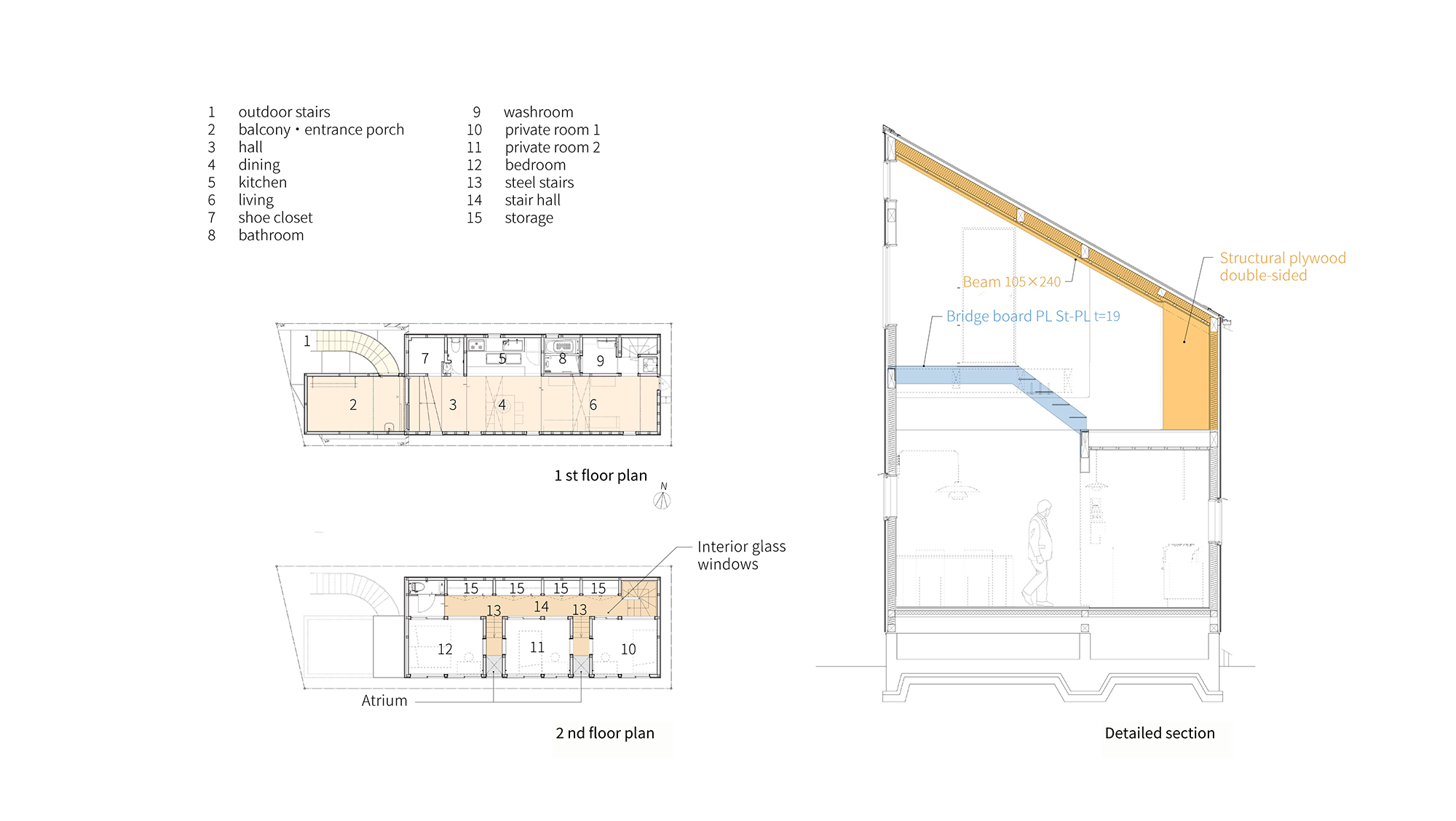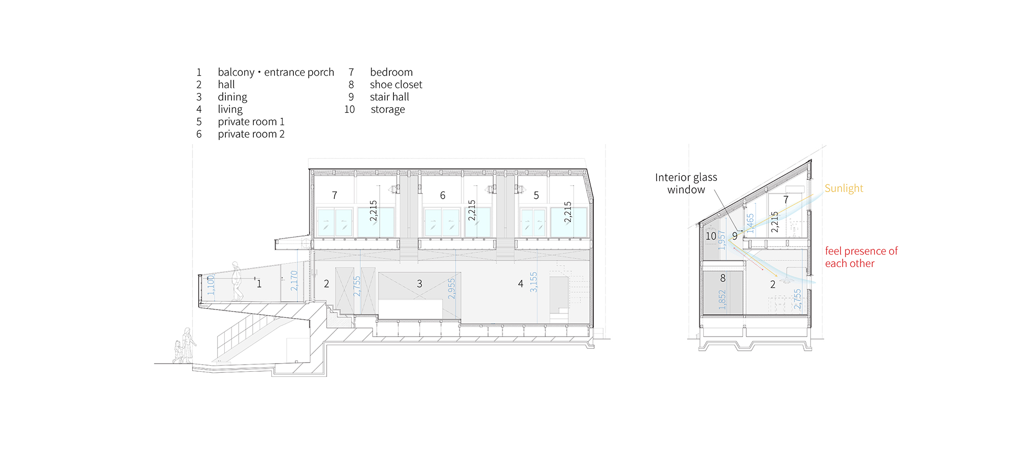 前面道路側に向かってバルコニーを大きく引き出して、空中に庭のような場所をつくっている。 そこはプライバシーやセキュリティが配慮された6.5畳分のスペースで、アウトドアダイニングを楽しんだり、植物を並べたり、夜風にあたりながらビールを飲んだり、天気のいい日にイスを出して読書したり、多用途に使える。その下に、建主の愛車をちょうど収めることもできる。 外部階段で直にアクセスするバルコニーは玄関ポーチを兼ねていて、そこから1階のホール・ダイニング・リビングへと徐々に下りながら空間が連続している。すべて合わせると31畳の広さで、一番奥のリビングの天井高さは3.1mになる。 1階から2階は、本棚や収納スペースを備えた階段室を介して斜めに吹き抜けている。家全体がスキップフロアで繋がっていて、建主家族4人が互いの気配を感じられると同時に、2階個室に設けた内装ガラス窓の開閉で居心地を調整できる構成になっている。 敷地は間口が6m、面積が30坪で、周囲には似た土地が並んでいた。法的条件からするとそこに建つ住宅のアウトラインも必然的に周囲と似たものになる状況だが、バルコニーには自由度が残されていたため、その作り方によって敷地と住宅の長所を最大限に引き出したいと考えた。 前面道路の向かいには植栽が整った低層の老人ホームがあり、敷地から見ると空への抜けが気持ち良い。したがって引き出したバルコニー腰壁の高さを先端で1.1mまで徐々に下げて開放感を持たせつつ、向かいの植栽を借景することにした。老人ホームは建ったばかりなのでしばらく風景は変わらないはずで、それは建主がこの敷地を購入した理由のひとつでもあった。竣工後から、さっそく様々な植物がバルコニーに持ち込まれていて、賑やかな雰囲気が生まれつつある。 1階は両脇に隣家が迫っているが、2階は隣家の屋根越しに日当たりがよく、そこから吹き抜けを伝って1階に柔らかな光が届く。窓を開ければ風が1階から2階へと通り抜けてゆく。吹き抜けの純度を高めるために、2階を支える見え掛かりの柱を取りやめて、代わりに鉄骨階段で支える構造としている。 内装は外装と連続感を持たせつつ、タイル・木・セメント系・塗装・リノリウムなどの素材を床・壁・天井で使い分けている。建主が素材選びに熱心だったこともあり、組み合わせの検討は念入りに行った。全体としてはシンプルで統一的な印象でありながら、各部に着目すると実は様々な表現や使い方が見えてくる、そんな奥行きを感じられる空間になればと考えた。 もっとも検討に時間をかけた外壁は質感のあるセメント系素材で包むように仕上げ、「引き出して」いる部分を異素材の塗装で切り替えている。 アウトラインを街並みに馴染ませながら、独自の住み心地と存在感を持たせようと試みている。 -中佐昭夫- Name of the Project : Drawer Balcony House The balcony is protruded toward the front road, creating a garden-like space in the air. It’s a 6.5-tatami mat or 12 sqm space with privacy and security in mind, where you can use in many ways such as enjoy outdoor dining, place pots of plants, drink beer in the evening breeze, or pull out a chair and read a book on a sunny day. The owner’s beloved car fits nicely under the balcony. The balcony, which is directly accessed by an external staircase, also function as the entrance porch. The space continues to extend from the entrance porch to 1st floor hall, dining room, living room stepping down at each space and gradually descending as move further into the house. The entire space of 1st floor is 31 tatami mat or In total, the area is 31-tatami mat or 57 sqm, and the ceiling height of the living room at the far end is 3.1 m. The first and second floors are connected through open staircase with bookshelves and storage which cuts off the scene diagonally. The entire house is connected by skip floors, allowing the four members of the family to feel each other’s presence, and at the same time, the interior glass windows in the private rooms on the second floor can be opened and closed to adjust the comfort level. The site had a frontage of 6 m and an area of 99 sqm, and was surrounded by similar lots. Given the regulatory conditions of the vicinity, the outline of the detached houses in the neighborhood would inevitably be similar to one another, but there was some flexibility left in the balcony, so we wanted to make the most of the lot and characterize the house by the way we define the balcony. Across the street stands a low-rise nursing home with well-trimmed trees, and when seen from the house, it has a pleasantly open view to the sky. Therefore, the protruding balcony side walls are gradually lowered toward the tip of the balcony to 1.1 m to create openness which is low enough to view the plants across the street. The nursing home had just been built, so the scenery was not expected to change for a while, which was one of the reasons the owner purchased this site. Since the construction was completed, various plants have been brought to the balcony, creating a lively atmosphere. The first floor is flanked by neighboring houses on both sides, but the second floor receives plenty of sunlight through the roof of the neighboring house, and from there, soft light reaches the first floor through the atrium. If you open the window, the wind will pass from the first floor to the sec