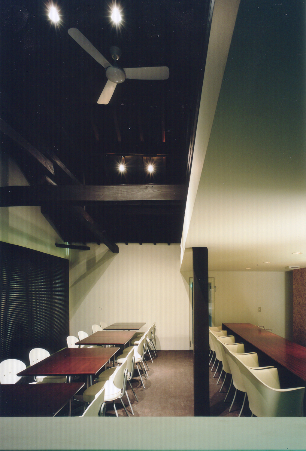われわれは、オーナーである徳森氏やスタッフの要望を聞いてビストロとバーとして成立するための最小限の条件と要望を聞き出し、それらの機能を、既存建物の上からワッと網で覆うように小細工無しで単純に重ね合わせてみた。もちろん看板などの装飾的なものは一切無い。その結果、店内の所々に既存の大黒柱や小屋組の架構が自然と現れることになったのである。
