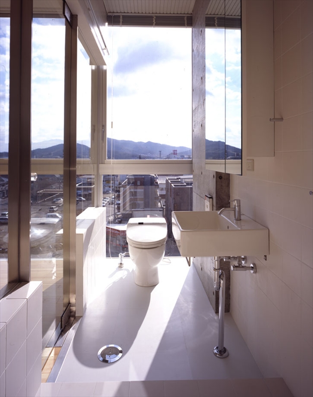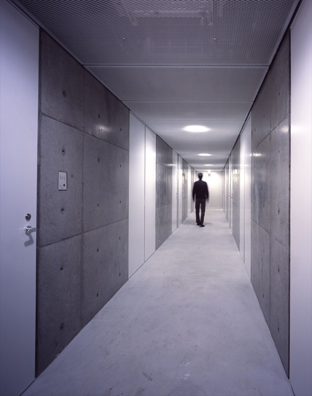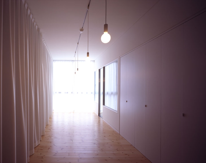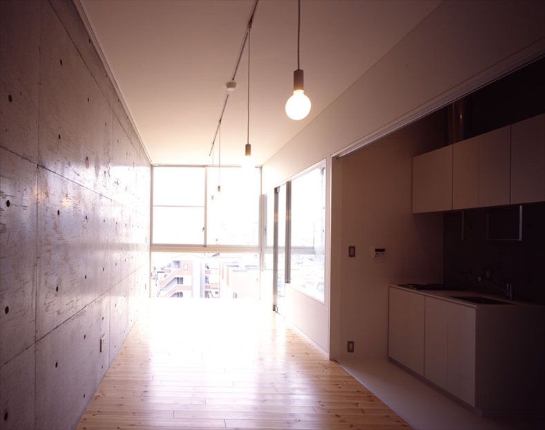 集合住宅は「FLAT FORM」の4・5階に、各フロア8戸ずつの計16戸が計画されている。全て同じ空間構成で、玄関、押入、台所、バスルームを片側に寄せて、最小限のスペースで直線状にまとめている。外部との境界は透明なガラスのみとし、その他の視界を遮るものを一切排除するために、バルコニーを設けないことにした。非難バルコニー、給湯器、室外機、換気扇の排気ダクトは、全て共用廊下の天井や壁の中に隠蔽している。バスルームを外部に接する位置に配置し、外部と接する面を全面開口部とすることで、自然換気・自然採光が可能となるので、この部分を物干しスペースとして利用している。このような取り組みがあってはじめて、集合住宅の開口部が透明であるという合理性が保たれるのであると思う。 -中薗哲也- |